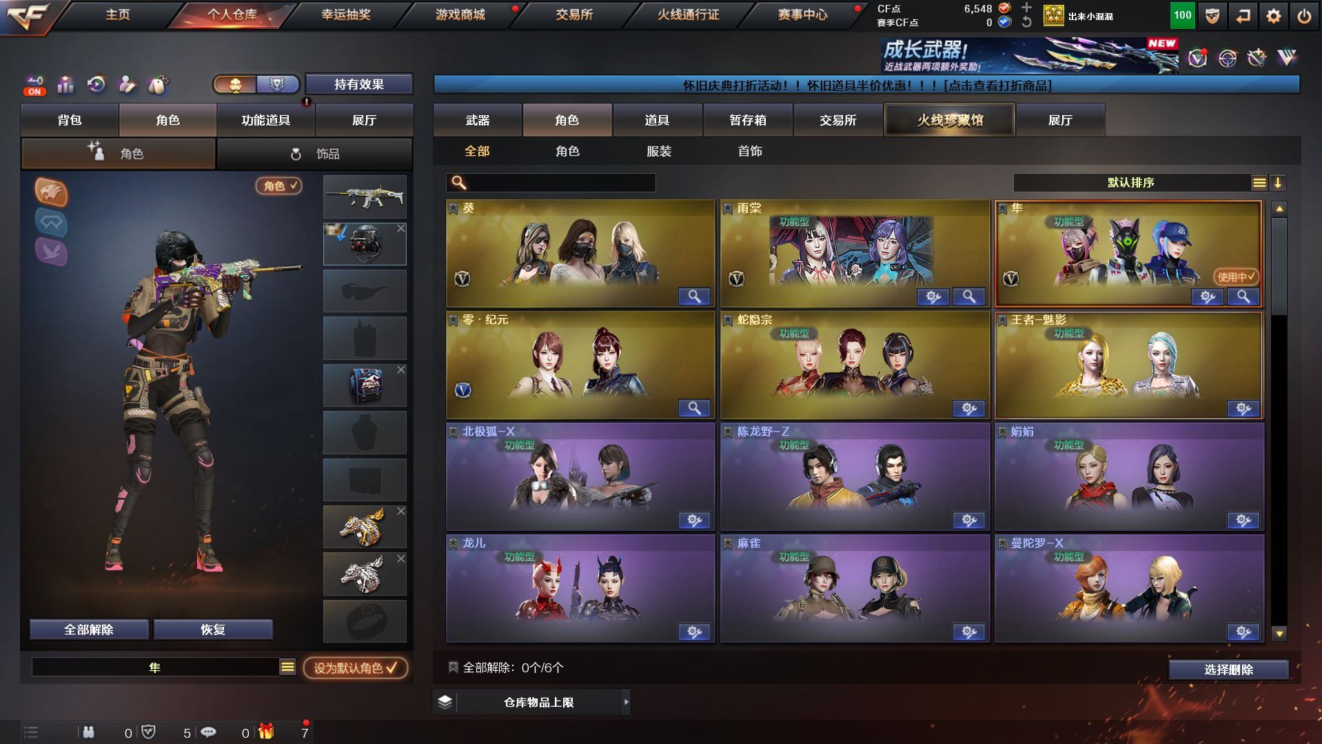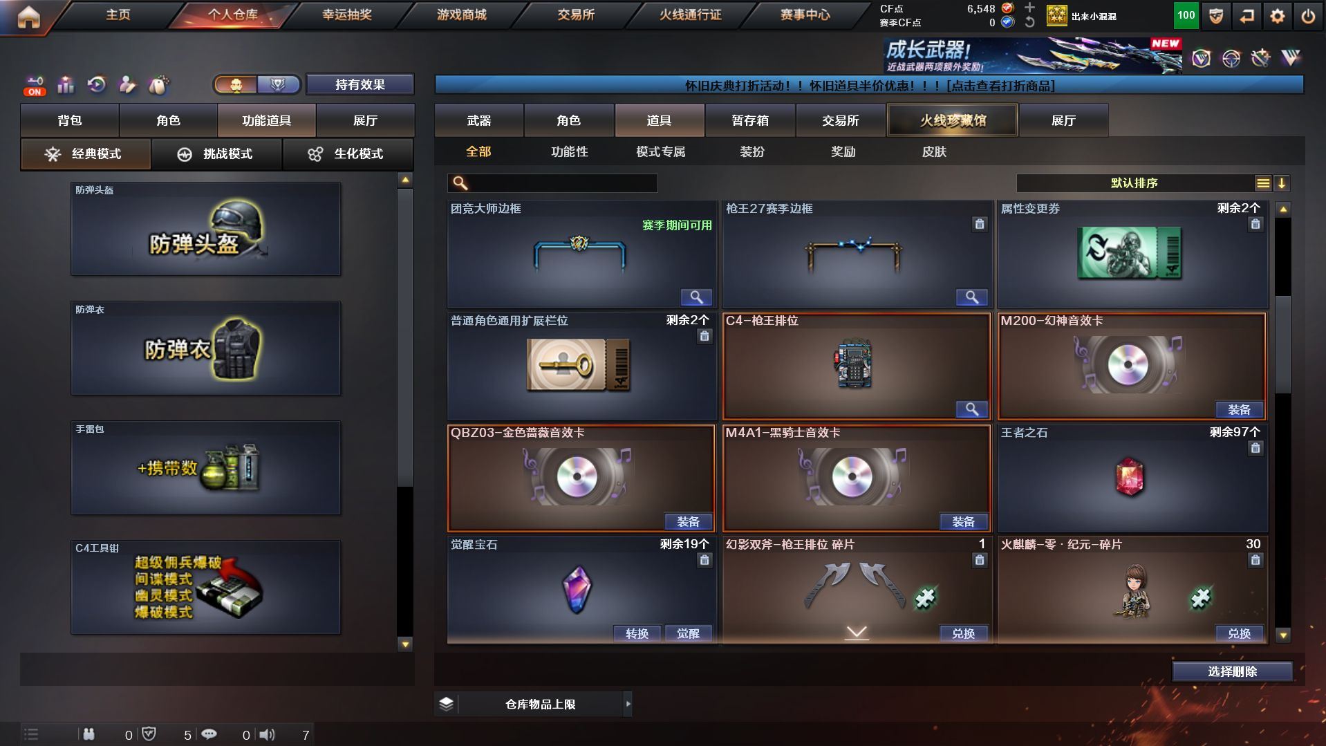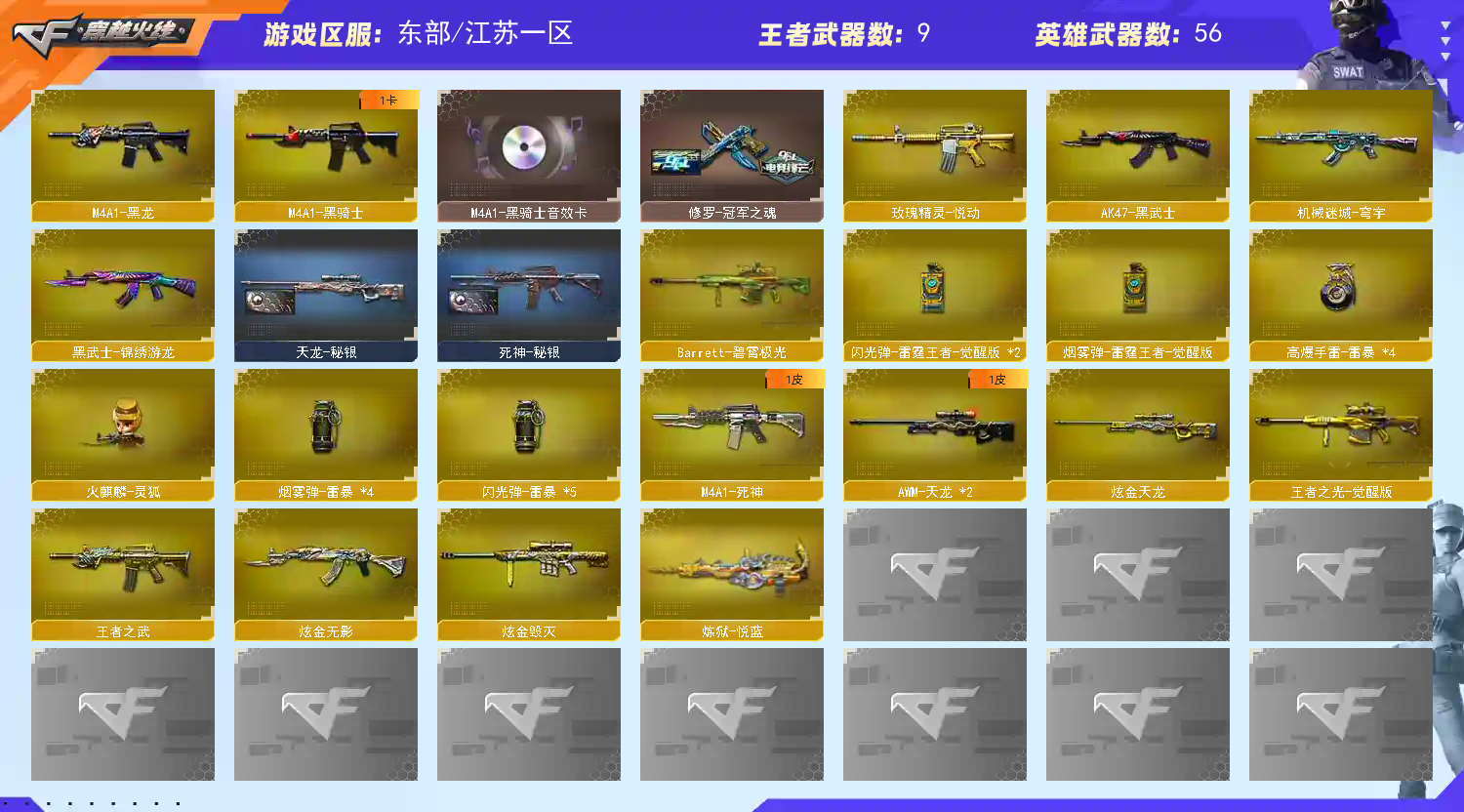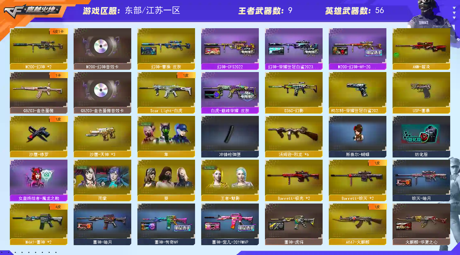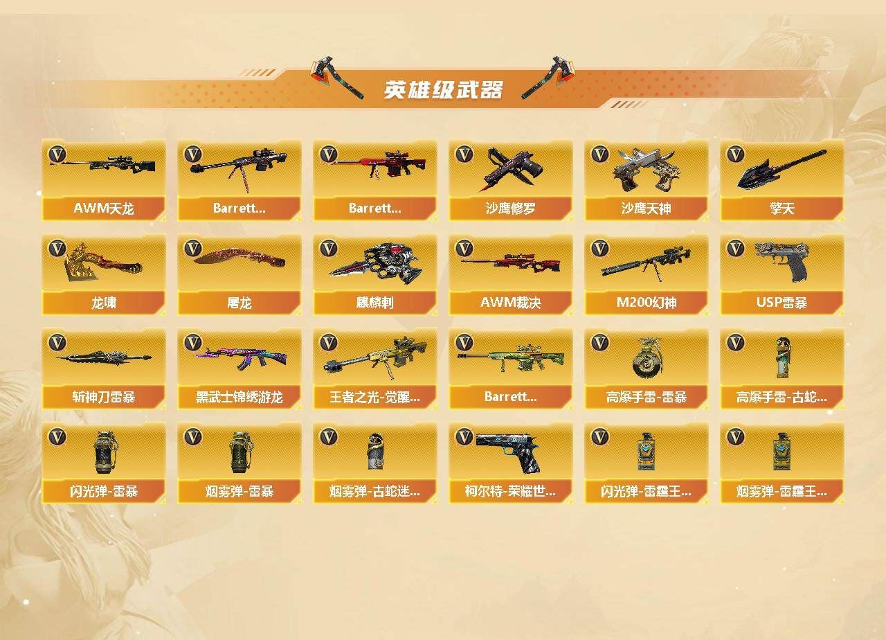 【热门武器】:G36C-幻影,QBZ03-金色蔷薇,Scar Light-白虎,M200-幻神*2,柯尔特-荣耀世冠白鲨2023,金色蔷薇-古蛇迷踪,修罗-古蛇迷踪,死亡之眼*3,M4A1-黑骑士,汤姆逊-烈龙*6,斯泰尔-蝴蝶,羊驼玩偶,降世魔童,USP-雷暴,沙鹰-修罗,炽芒蝶刃-荣耀世冠白鲨2023 皮肤【王者炫金武器】:王者之武,玫瑰精灵-悦动,炼狱-悦蓝,王者之锋,炫金无影,炫金毁灭,炫金天龙【音效卡】:M200-幻神音效卡,M4A1-黑骑士音效卡【皮肤】:幻神-CFS2022,M200-幻神-N9-2022MVP,幻神-荣耀世冠白鲨2023 皮肤,幻神-曹操 皮肤,白虎-巅峰荣耀 皮肤,雷神-暗月,雷神-虎将,雷神-传奇N9,雷神-宠儿-2019MVP,火麒麟-华夏之心,毁灭-暗月,毁灭-英雄计划 皮肤,死神-秘银,天龙-秘银,修罗-冠军之魂,麒麟刺-荣耀世冠白鲨,炽芒蝶刃-荣耀世冠白鲨2023 皮肤【角色】:葵,雨棠,隼,王者-魅影,蛇隐宗,北极狐-X,娟娟,龙儿,麻雀,曼陀罗-X,蛇姬,影武者-X,游珑儿【人偶武器】:火麒麟-灵狐,M4A1-雷神-精英刀锋,斯泰尔-蝴蝶,生化手雷-机甲核心,降世魔童【暴走生化】:死亡之眼*3【挑战大师】:神圣爆裂者III【英雄级武器】:AK47-火麒麟,M4A1-黑龙,M4A1-雷神*2,M4A1-黑骑士,M4A1-死神,AK47-黑武士,Scar Light-白虎,G36C-幻影,黑武士-锦绣游龙,金色蔷薇-古蛇迷踪,QBZ03-金色蔷薇,AWM-天龙*2,Barrett-毁灭*2,Barrett-极光*2,AWM-裁决,M200-幻神*2,王者之光-觉醒版,汤姆逊-烈龙*6,沙鹰-修罗,沙鹰-天神*3,USP-雷暴,柯尔特-荣耀世冠白鲨2023,修罗-古蛇迷踪,屠龙,龙啸,擎天*2,麒麟刺,斩神刀-雷暴,高爆手雷-雷暴*4,高爆手雷-古蛇迷踪,闪光弹-雷暴*5,闪光弹-雷霆王者-觉醒版*2,烟雾弹-雷暴*4,烟雾弹-古蛇迷踪,烟雾弹-雷霆王者-觉醒版,Barrett-碧霄极光【道具】:BS战队炫彩背包,CFS限定背包,古蛇迷踪炫彩背包,女皇终结者-背包,超级背包,女皇终结者-魔龙之吻,变异宝贝,夺命之镰,防化服,金色流光-枪王排位,星辰流光-枪王排位,巅峰赛先锋-金色流光,枪王排位28赛季金色流光,枪王排位29赛季金色流光,古蛇迷踪特效,蛇隐宗表情,EP战队击杀图标,防弹头盔,防弹衣,C4工具钳,手雷包【特殊枪械】:蝴蝶斯泰尔+6烈龙,1白虎,1黑骑士,6烈龙,1蝴蝶斯泰尔;USP-雷暴,柯尔特-荣耀世冠白鲨2023,隼,QBZ03-金色蔷薇,G36C-幻影,M200-幻神,Scar Light-白虎,