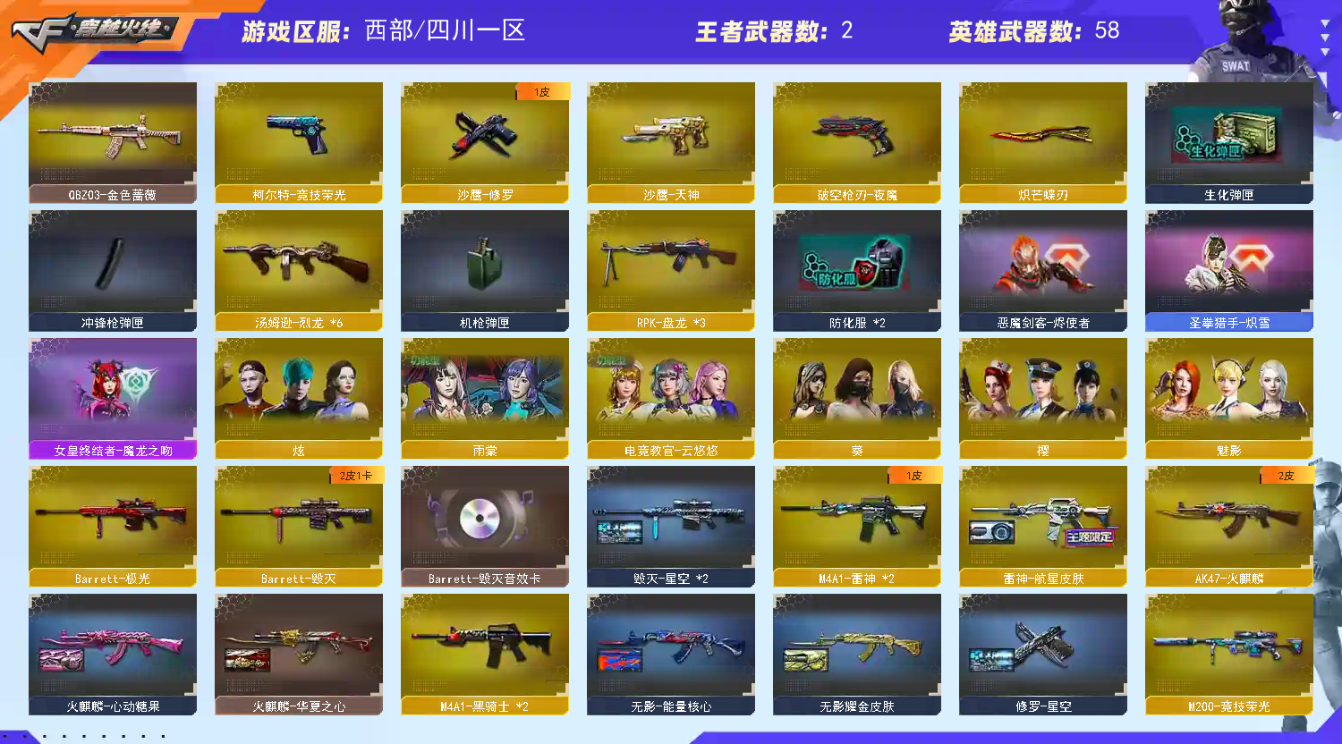 首页 > 租号大厅 > 穿越火线 > 西部/四川一区 > 六烈龙,炽芒蝶刃,毁灭修罗星空皮,毁灭音效卡,竞技荣光套装,六英雄角色