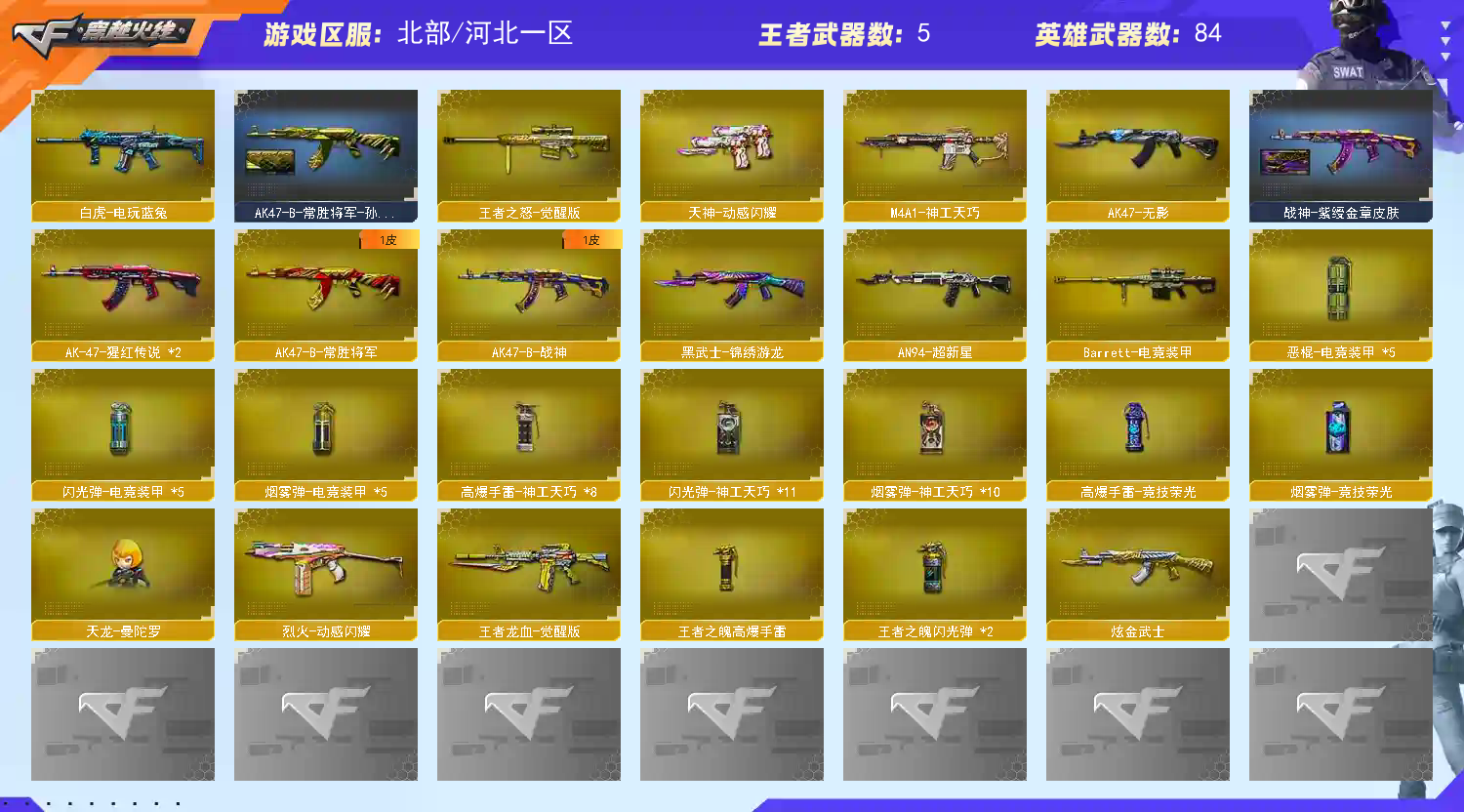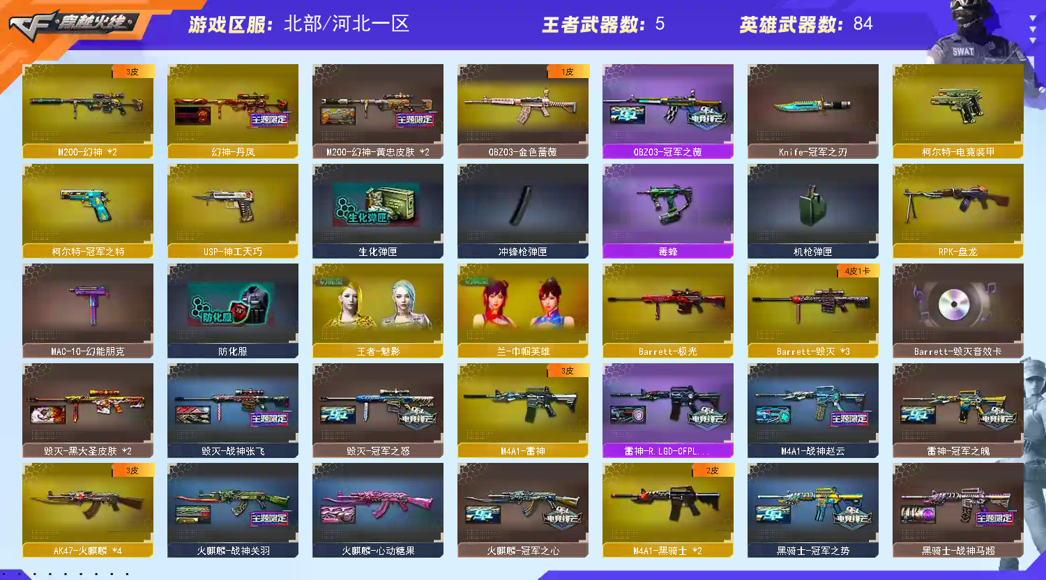 毒蜂,黄金猫猫手套-白鲨,柯尔特-冠军之特,Knife-冠军之刃,M200-幻神,M4A1-黑骑士,QBZ03-金色蔷薇,RPK-盘龙,白虎-电玩蓝兔,COP-白鲨【王者炫金武器】:炫金武士,王者之魄高爆手雷,王者之魄闪光弹【音效卡】:白鲨语音包,Barrett-毁灭,绝迹语音包,AN94-超新星-热带奇洋,70KG语音包【皮肤】:毁灭-黑大圣,幻神-丹凤,火麒麟-冠军之心,火麒麟-战神关羽,火麒麟-心动糖果,毁灭-冠军之怒,毁灭-战神张飞,黑龙-冠军之武,黑骑士-冠军之势,黑骑士-战神马超,雷神-冠军之魄,雷神-R.LGD-CFPLS18冠军,炼狱-星空,M200-幻神-黄忠,M4A1-战神赵云,QBZ03-冠军之薇【角色】:兰-巾帼英雄,灵动武士,灵狐者-职业经理,蜀雪,铁骑荣耀,王者-魅影,奇洋探员,乔伊教练,修道士,云海玲珑,风暴女,嘉年华灵狐,娟娟,葵-赛博朋克,灵狐-花神,龙儿-小淘气【人偶武器】:AWM-灵狐-15周年嘉年华,雷神-枪娘蕾安娜,灵狐娃娃手雷,迷你超能女侍,天龙-曼陀罗,COP-白鲨【暴走生化】:超级对讲机,毒蜂【挑战大师】:神圣爆裂者-末日III【英雄级武器】:AK47-火麒麟,AK47-无影,AN94-超新星,Barrett-毁灭,Barrett-极光,Barrett-电竞装甲,柯尔特-冠军之特,柯尔特-电竞装甲,M4A1-雷神,M4A1-黑骑士,M4A1-神工天巧,M200-幻神,尼泊尔-电竞装甲,擎天-竞技荣光,RPK-盘龙,唐刀-神工天巧【源级武器】:源·AK47-黑武士,擎天-惨叫迹【道具】:AG战队炫彩背包,BS战队炫彩背包,奇洋探员-海龟背包,超级背包,夺命之镰,防化服,金色流光-枪王排位,星辰流光-枪王排位,枪王排位28赛季金色流光,枪王排位29赛季金色流光,电玩兔兔表情,动感闪耀表情,EP战队名片,防弹头盔,防弹衣,C4工具钳【特殊枪械】:1黑骑士,1盘龙;柯尔特-冠军之特,Knife-冠军之刃,RPK-盘龙,QBZ03-金色蔷薇,M200-幻神,