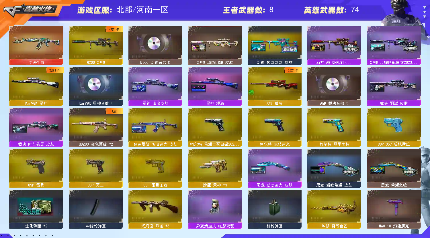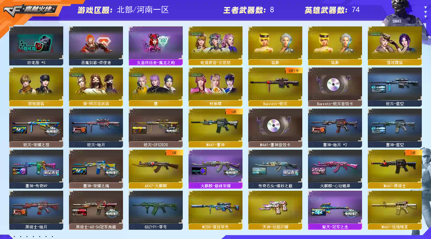 此账号和平台属于合作关系,已经备案。如果账号封号或者什么的,商户将会协助平台然后报警。 收藏好评!由于异地登录保护机制,部分客户在使用客户端自动上号时会出现密码错误,注意本号密码不会错误,请多尝试5-6次!本账号已经过虚拟财产-认1证。请素质租号,文明游戏,谢谢大家配合!!!;USP-雷暴,USP-雷暴王者,柯尔特-荣耀世冠白鲨2023,柯尔特-冠军之特,电竞教官-云悠悠,QBZ03-金色蔷薇,M200-幻神,