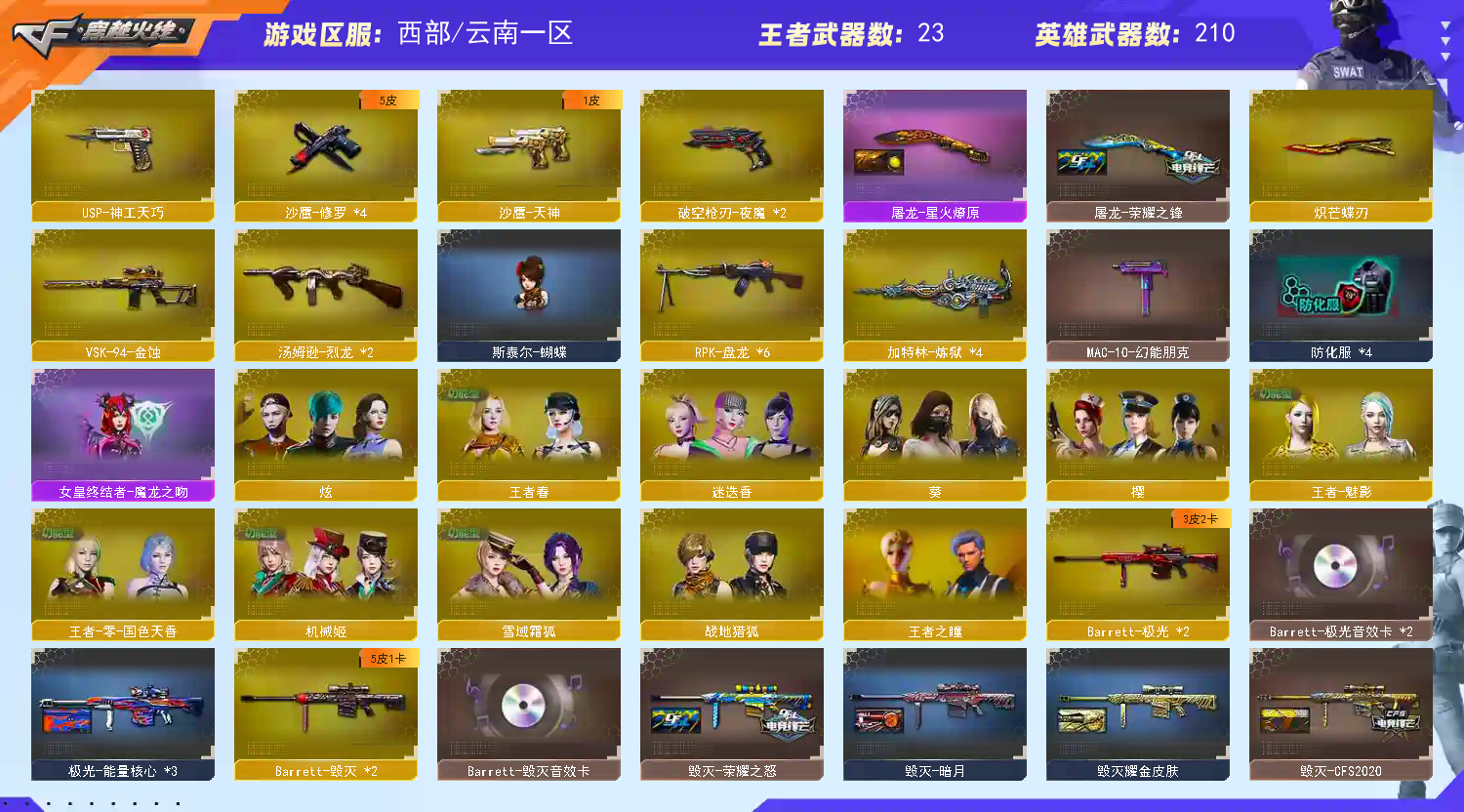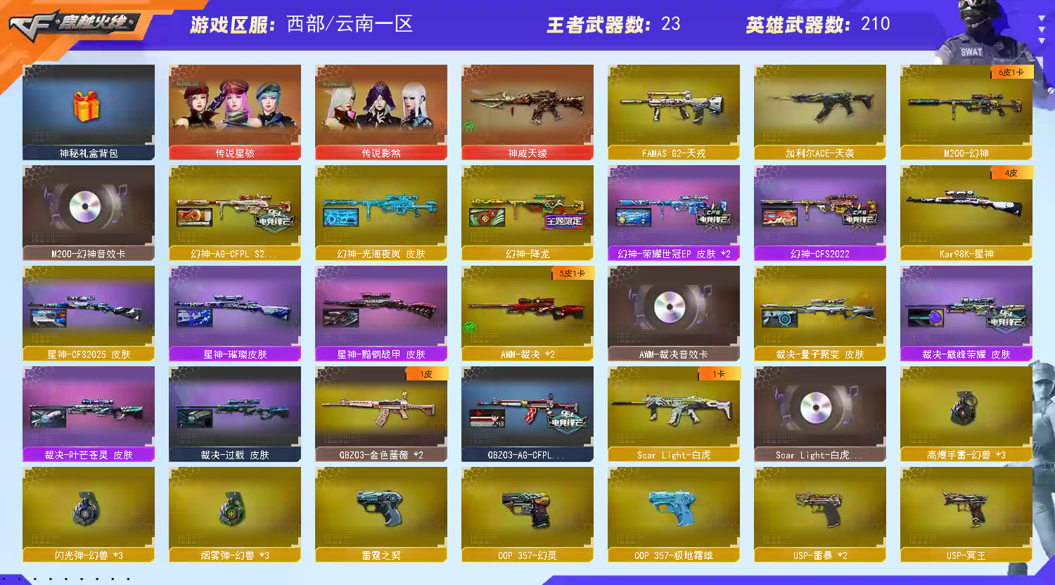 【亮点解析 双传说角色 绝版幻兽套 幻神5皮带卡 裁决三件套 白虎带卡 幻神光海夜岚 生化满配 金色ID】【幻兽套 雷*3】【四防传说星骇 四防传说影煞】【m200幻神+幻神音效卡+光海夜岚+cfs2022+ag24冠军+荣耀世冠ep+降龙】【98k星神+拼搏 +cfs2025】【98k量子之心】【神威天绫】【6盘龙 炼狱*4 烈龙*2 6黑骑士 斯太尔蝴蝶 炽芒蝶刃】【scar白虎+白虎音效卡】【qbz金色蔷薇+ag19冠军】【朱雀】【天戎 加利尔天袭】【火麒麟+卡】【黑龙+卡】【雷神+卡+n9】【黑骑士+卡 】【毁灭+卡+冠军之怒+荣耀之怒+cfs2018+sv16冠军】【极光+卡】【裁决 +裁决音效卡+量子聚变+巅峰荣耀】【量子之心套 幻兽套装/夜魔套装/雷暴套装】【武器:雷暴 夜魔 王者之心 王者之翼 王者之势 王者之烈 海王 金蚀】【15手枪:修罗*4 天神 雷霆 usp雷暴*2 夜魔 幻灵 神工天巧 usp冥王 沙鹰幻兽*3】【24刀具:屠龙*6 龙啸 擎天 麒麟刺*4 尼泊尔雷霆 斩神刀雷暴 堕天神 夜魔 玄豹 女皇利刃幻兽 王者之啸】【24雷套:雷霆雷*5 雷暴雷*7 幻兽雷*3 堕天神雷*4 夜魔雷*5】【小人枪:雷神精英刀锋 火麒麟绝迹 火麒麟灵狐 天龙曼陀罗 】【音效卡:雷神音效卡 火麒麟音效卡 极光音效卡 黑龙音效卡 裁决音效卡 黑骑士音效卡 毁灭音效卡 幻神音效卡 白虎音效卡 】【四防角色:王者春 王者零国色天香 王者魅影 】(神秘礼盒背包;USP-雷暴,炽芒蝶刃,传说影煞,传说星骇,RPK-盘龙,QBZ03-金色蔷薇,M200-幻神,