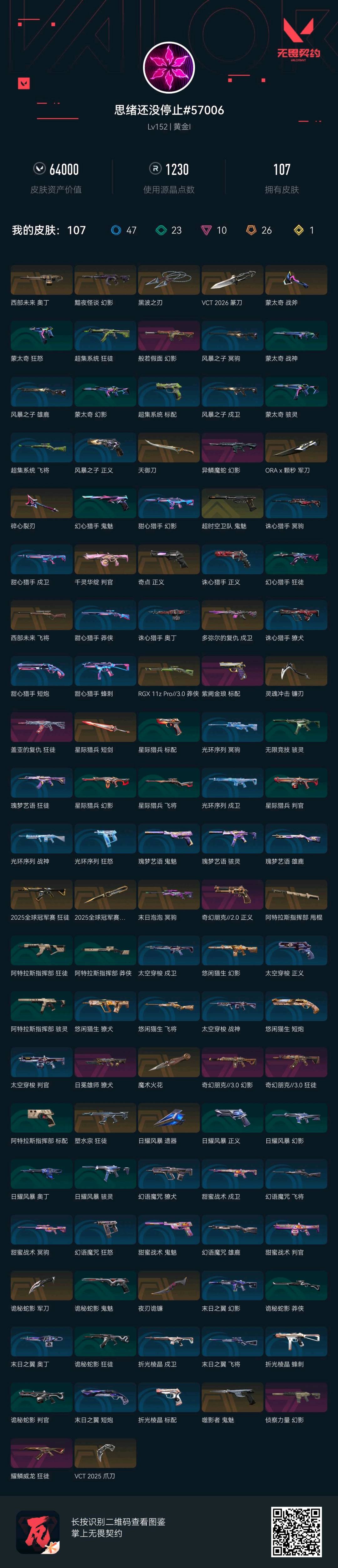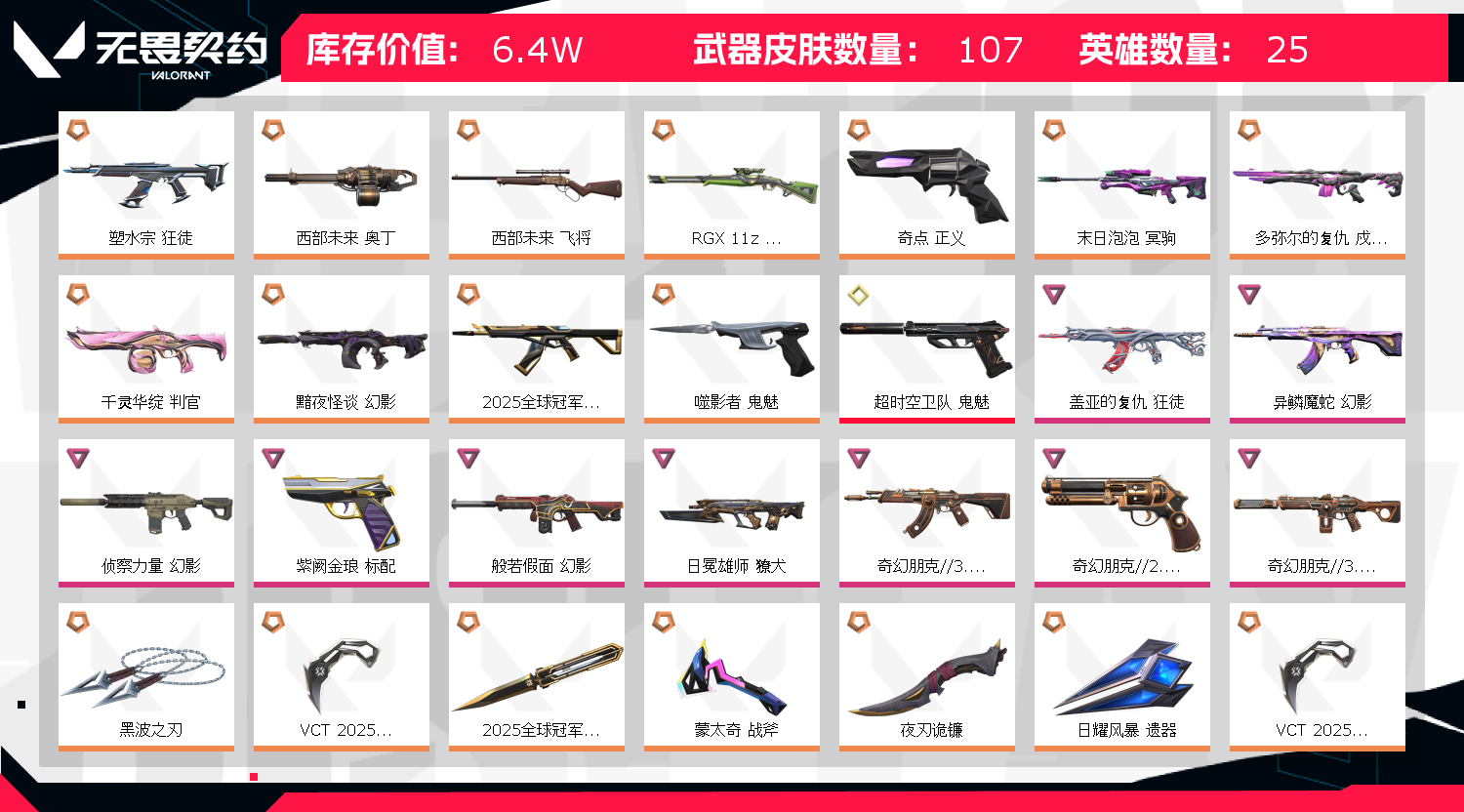 不允许开挂被封了的话 均会进行维权 账号价值已够 英雄22 武器皮肤数量107 - 西部未来 奥丁- 黯夜怪谈 幻影- 黑波之刃- VCT 2026 篆刀- 蒙太奇 战斧- 天御刀- ORA x 颗秒 军刀- 碎心裂刃 - 西部未来 飞将- 多弥尔的复仇 戍卫- RGX 11z Pro//3.0...- 灵魂冲击 镰刃- 星际猎兵 短剑- 2025全球冠军赛 狂徒- 2025全球冠军赛 蝴...- 末日泡泡 冥驹 魔术火花- 塑水宗 狂徒- 日耀风暴 遗器- 诡秘蛇影 军刀- 夜刃诡镰- 噬影者 鬼魅- VCT 2025 爪刀 - 超时空卫队 鬼魅- 般若假面 幻影- 异鳞魔蛇 幻影- 紫阙金琅 标配- 盖亚的复仇 狂徒- 奇幻朋克//2.0 正义- 日冕雄师 獠犬- 奇幻朋克//3.0 幻影- 盖亚的复仇 狂徒- 奇幻朋克//2.0 正义- 日冕雄师 獠犬- 奇幻朋克//3.0 幻影- 奇幻朋克//3.0 狂徒- 侦察力量 幻影- 耀鳞威龙 狂徒;西部未来 奥丁,黑波之刃,VCT 2025 爪刀,盖亚的复仇 狂徒,异鳞魔蛇 幻影,侦察力量 幻影,塑水宗 狂徒,