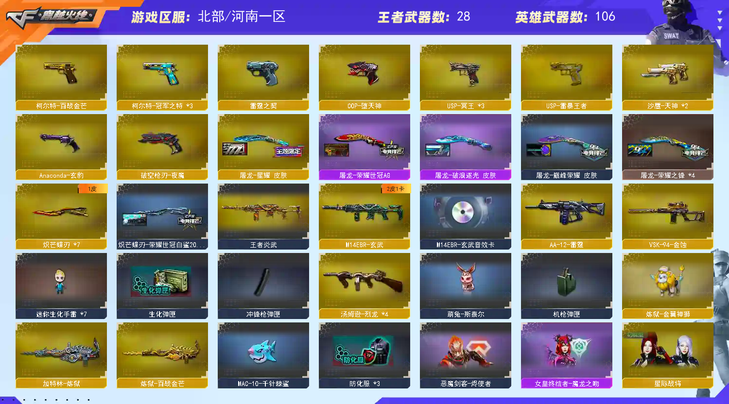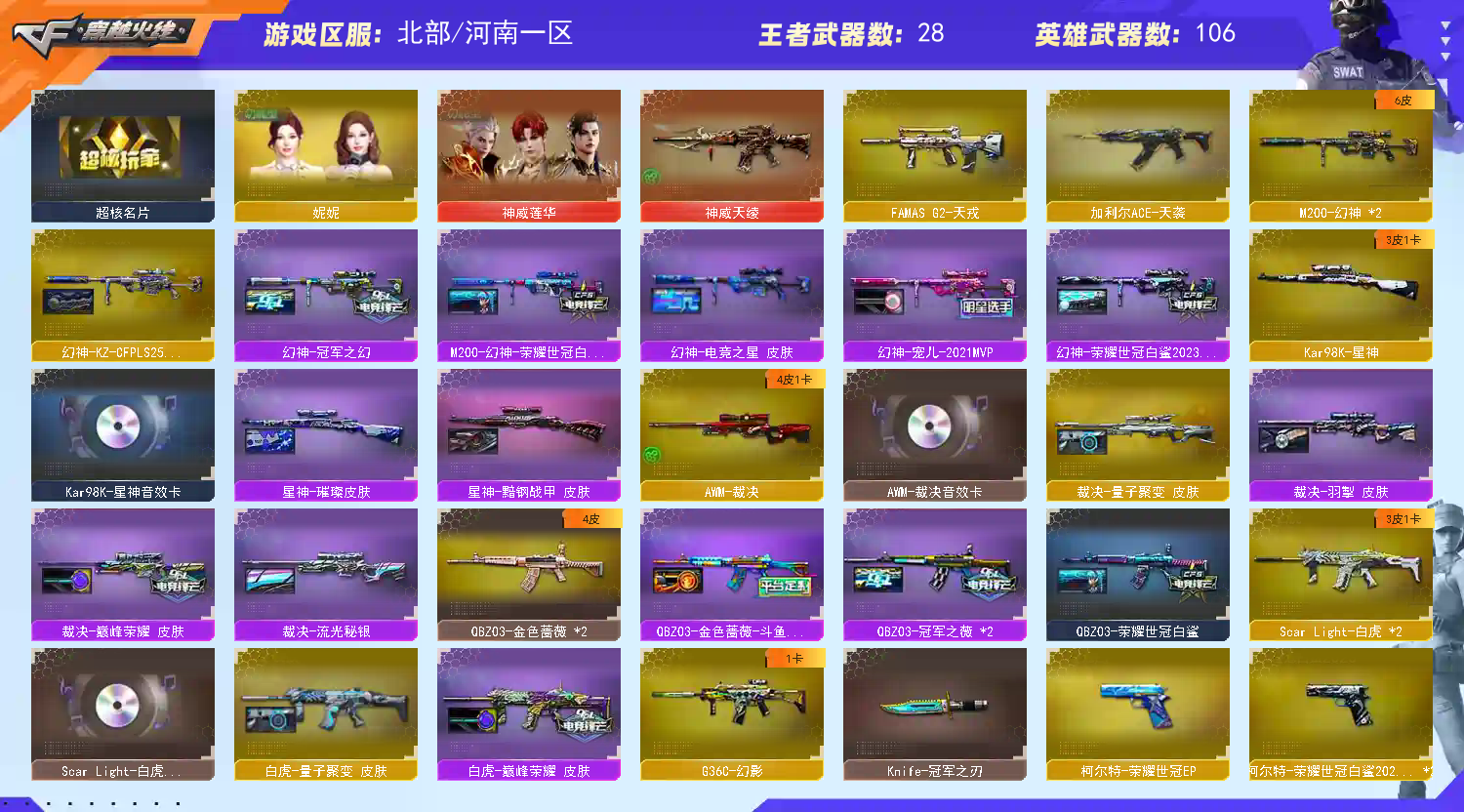 神威莲华✨7把炽芒蝶刃✨玄武带双皮肤和音效卡✨王者炎武✨烈狱金狮子✨斯太尔萌兔✨g36c幻影✨法玛斯天戎✨幻神带很多质量皮✨冠军之特✨鲨鱼手套;USP-雷暴王者,柯尔特-荣耀世冠白鲨2023,柯尔特-冠军之特,炽芒蝶刃,Knife-冠军之刃,妮妮,QBZ03-金色蔷薇,