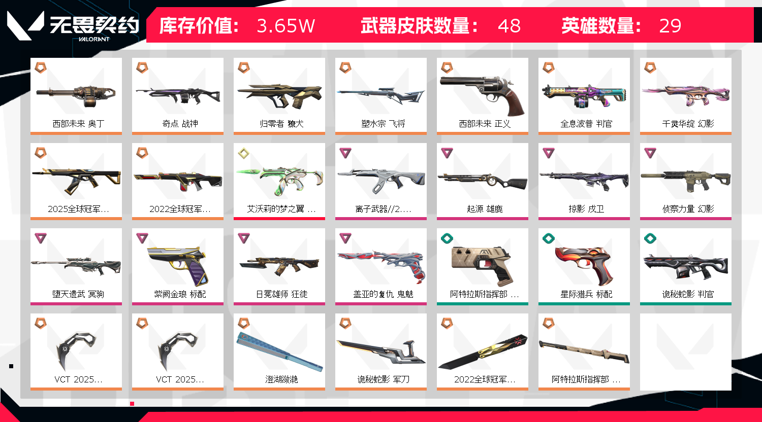英雄28 武器皮肤数量48;西部未来 奥丁,奇点 战神,VCT 2025 爪刀,起源 雄鹿,归零者 獠犬,掠影 戍卫,侦察力量 幻影,