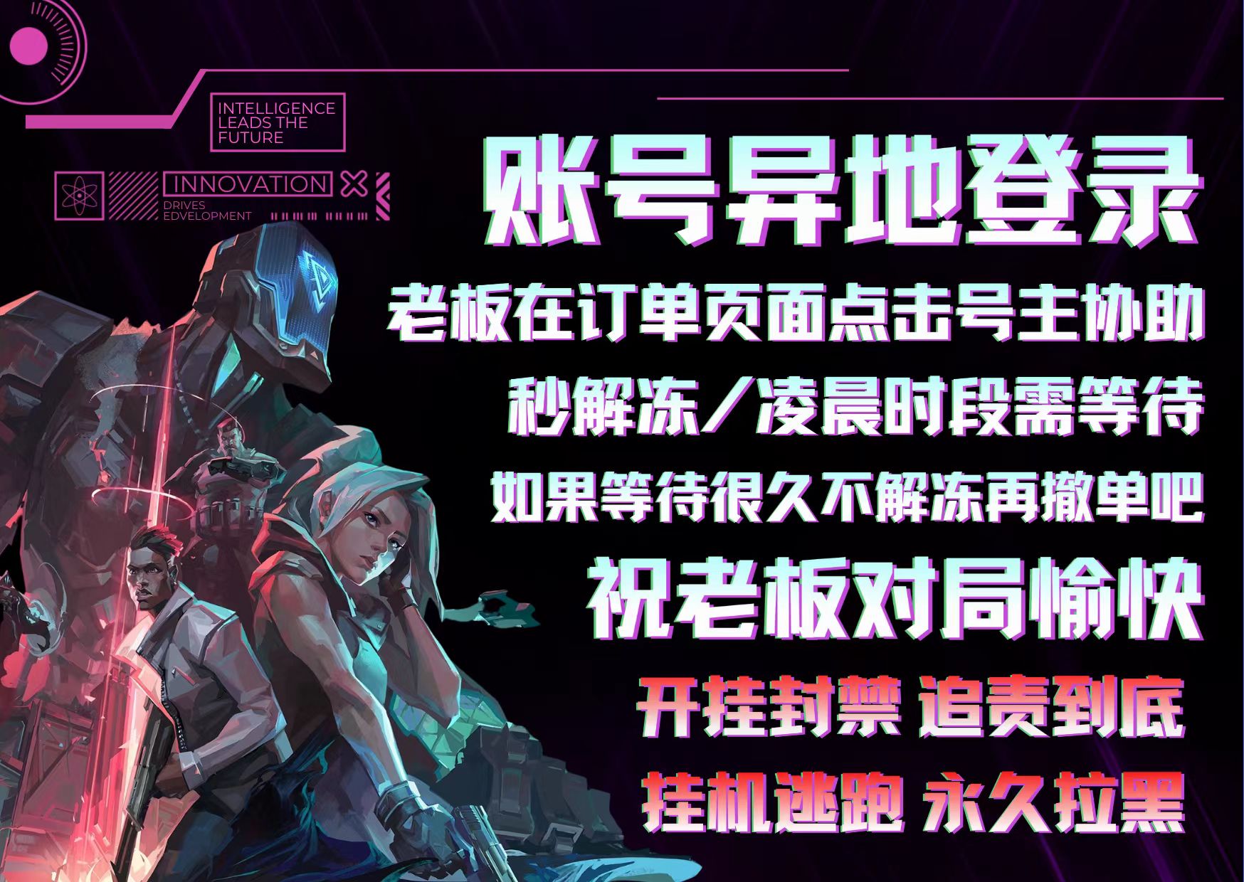 🎮 游戏租号尊享规则手册 🔴 红线禁令·违者严惩 1. 绝对禁炸鱼:严禁炸鱼行为,违规极易导致账号封号,大佬请控制击杀数在20以内,感谢配合; 2. 零容忍违规软件:禁用向日葵、ToDesk等远程工具及罗技相关程序,此类风险软件一经检测直接完结订单;第三方插件、外挂同理,平台核查后立即终止服务。工作室开启24小时后台截图监控,虚拟财产已向市场监督管理总局登记,开挂行为必追究赔偿,直至维权到位。 🟡 登录/冻结应急指南 • 冻结解锁:先关闭游戏客户端,在登号订单页点击【解除冻结】,3分钟内完成解锁,重启游戏即可登录; • 登录须知:登录界面(含WeGame)需耐心等待2分钟自动;西部未来 奥丁,掠影 狂徒,堕天遗武 狂徒,混沌序曲 狂徒,堕天遗武 冥驹,西部未来 飞将,西部未来 正义,