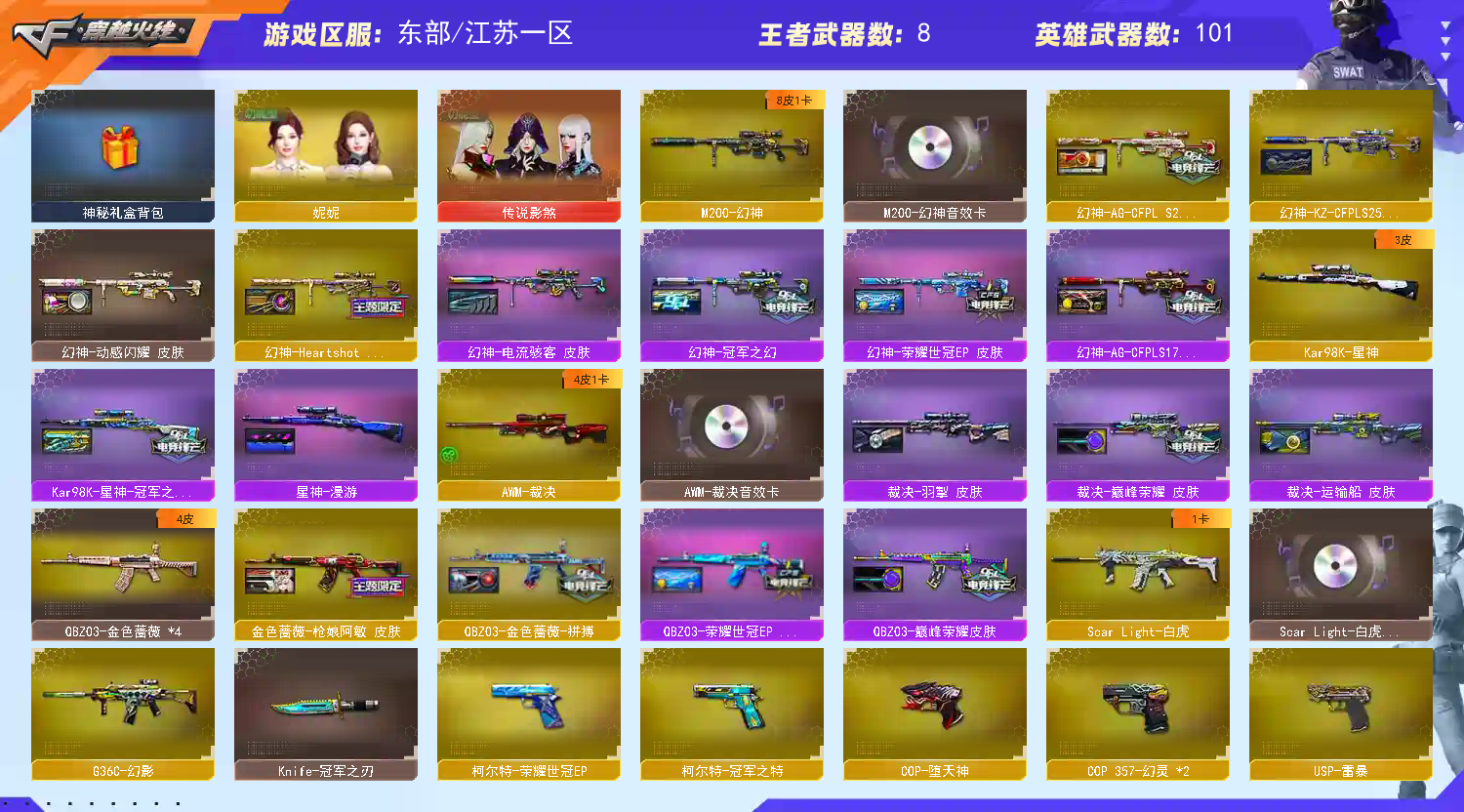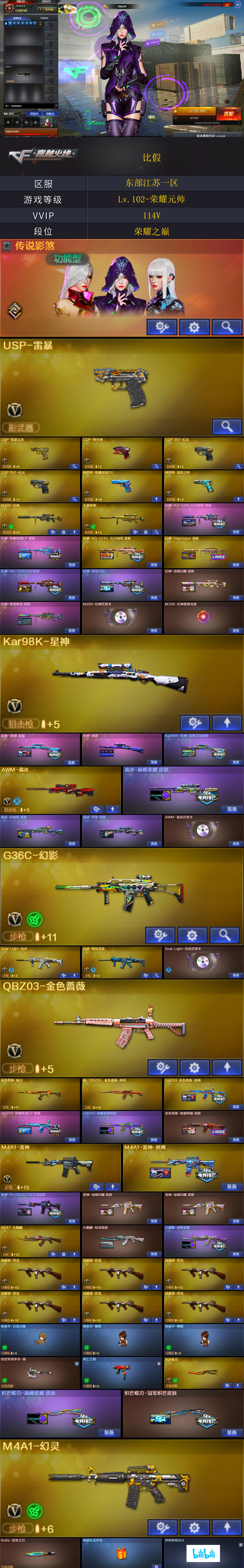 【商品标题】:东部江苏一区-114V-可二次实名-【Lv.102-荣耀元帅】-【段位:荣耀之巅】 【稀有武器】:M200-幻神/Kar98K-星神/G36C-幻影/ScarLight-白虎/M4A1-幻灵/USP-雷暴/COP-堕天神/COP357-幻灵(2)/天神-动感闪耀/修罗-古蛇迷踪/柯尔特-冠军之特/金色蔷薇-古蛇迷踪/QBZ03-金色蔷薇(4)/AK47-火麒麟(2)/M4A1-雷神(2)/白虎-电玩蓝兔/Barrett-毁灭/AWM-裁决/汤姆逊-烈龙(6)/炽芒蝶刃/斩神刀-雷暴/幻灵之锋 【王者武器】:王者风神-觉醒版 【热门角色】:传说影煞/枪娘樱/鹰/影豹/隼/奇洋探员/乔伊教练/蛇隐宗/王者春/王者雾萌萌/王者鹰/女主播/兔囡囡/幽/潘多拉 【热门音效卡】:M200-幻神音效卡/AWM-裁决音效卡/Scar Light-白虎音效卡 【热门皮肤】:幻神-AG-CFPLS24冠军皮肤/幻神-Heartshot皮肤/幻神-AG-CFPLS17冠军/幻神-冠军之幻/幻神-电流骇客皮肤/幻神-动感闪耀皮肤/裁决-巅峰荣耀皮肤/毁灭-HeartShot皮肤/星神-漫游/QBZ03-巅峰荣耀皮肤/裁决-羽掣皮肤/Kar98K-星神-冠军之星皮肤/雷神-R.LGD-CFPLS18冠军/火麒麟-巅峰荣耀/屠龙-破浪逐光皮肤/毁灭-直播专属/屠龙-巅峰荣耀皮肤/黑骑士-AG-S4冠军典藏/金色蔷薇-枪娘阿敏皮肤/屠龙-春桃皮肤/炽芒蝶刃-冠军炽芒皮肤 【其他亮点】:斯泰尔-蝴蝶(2)/Knife-冠军之刃/金刚伞-电玩红兔/哔哩哔哩名片 (截图展示段位不代表实际段位,如赛季更新等不可抗拒因素发生变化,其余道具看截图或咨询客服);USP-雷暴,USP-雷暴王者,柯尔特-冠军之特,炽芒蝶刃,Knife-冠军之刃,传说影煞,隼,