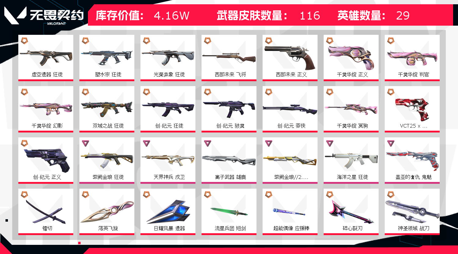 千灵华绽套装,创纪元套装;镭切,虚空遗器 狂徒,紫阙金琅 狂徒,天界神兵 戍卫,塑水宗 狂徒,光荣异象 狂徒,西部未来 飞将,