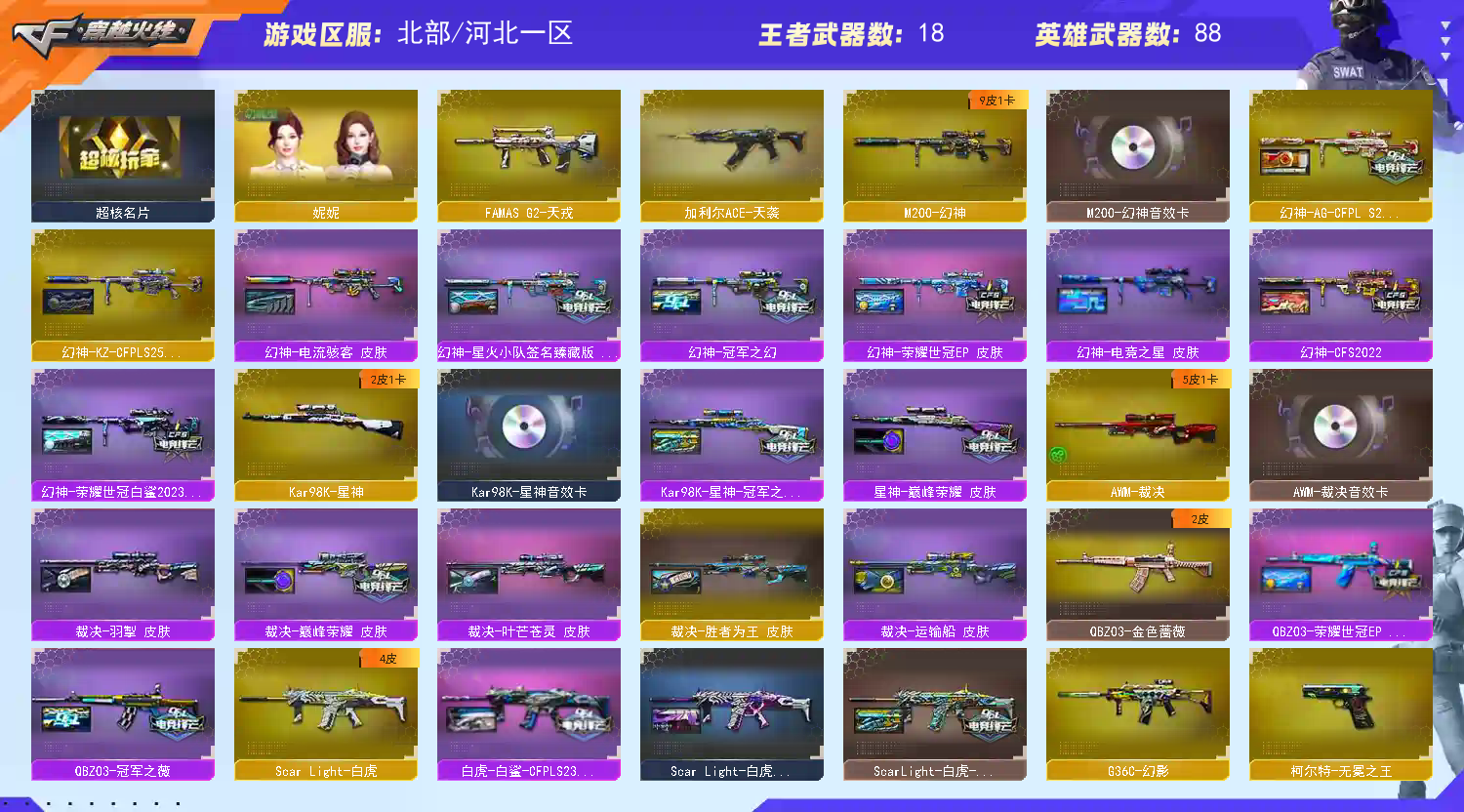 角色妮妮 玄豹 天袭 天戎 幻影 三冠特 白鲨特 EP特 无冕之王 幻神KZ EP AG冠军之环9皮三件套 星神冠军之星三件套 裁决巅峰三件套 QBZ EP 冠军之薇 白虎 冠军之虎 拼搏 白鲨冠军 雷神荣耀 毁灭2018荣耀 三件套;柯尔特-无冕之王,柯尔特-荣耀世冠白鲨2023,柯尔特-冠军之特,炽芒蝶刃,妮妮,QBZ03-金色蔷薇,G36C-幻影,