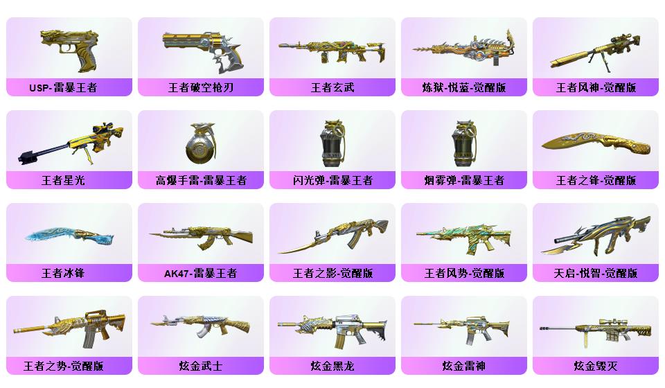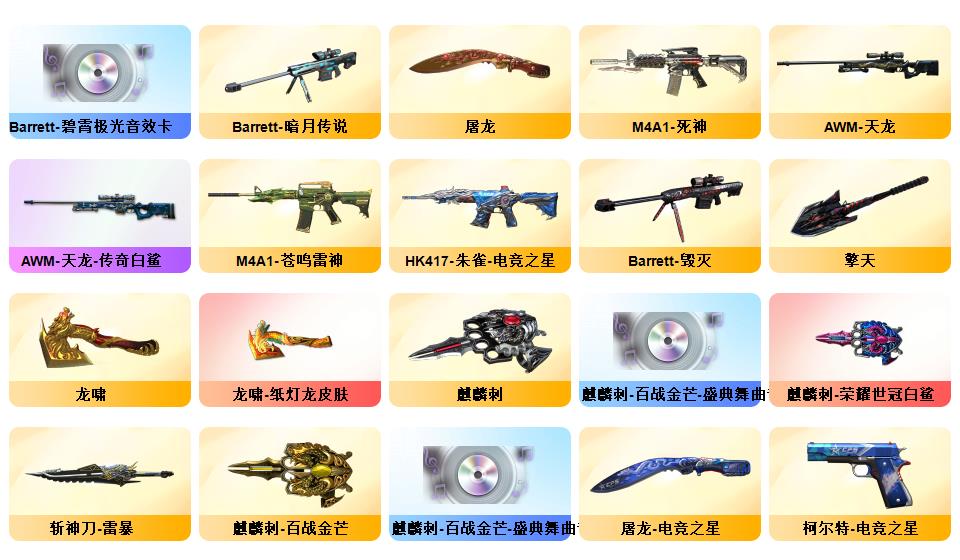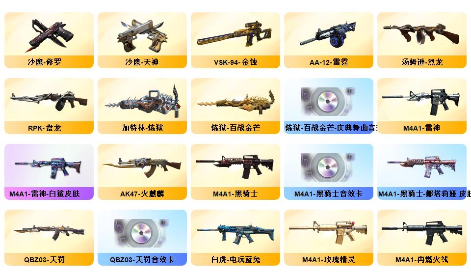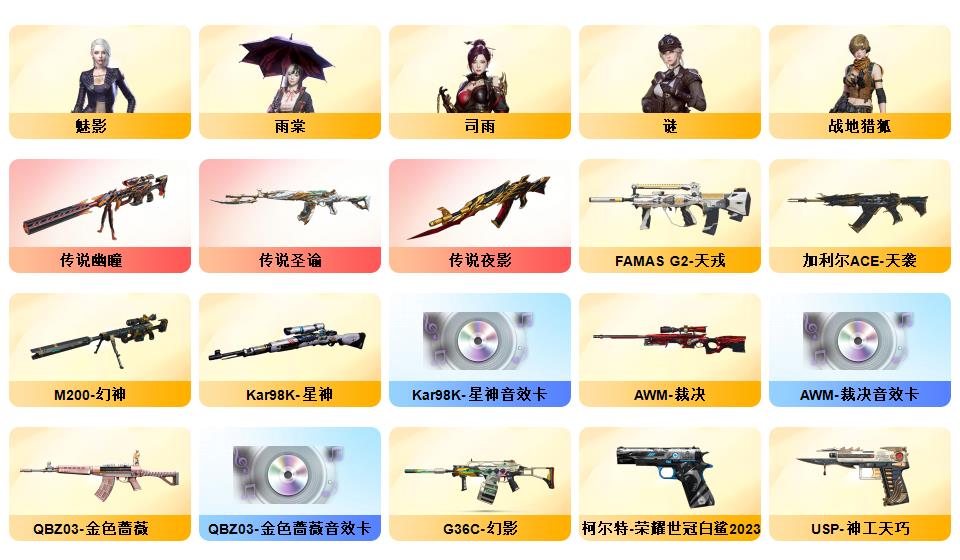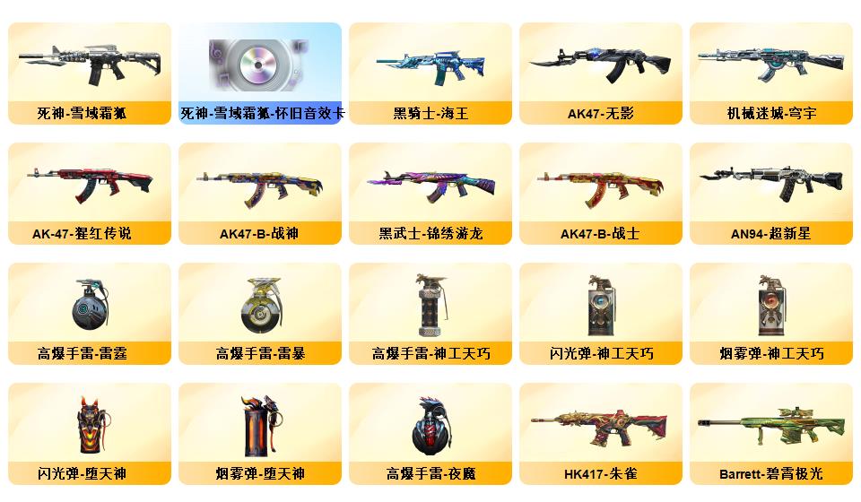 100V 传说夜影,传说幽瞳,传说圣谕,G36C-幻影,QBZ03-金色蔷薇,HK417-朱雀,M200-幻神,柯尔特-荣耀世冠白鲨2023,金色蔷薇-古蛇迷踪,修罗-古蛇迷踪,死亡之眼*2,白虎-电玩蓝兔,Kar98K-星神,Cat-刀锋,牛牛-AK47,M4A1-黑骑士,汤姆逊-烈龙,RPK-盘龙,加特林-炼狱,斯泰尔-蝴蝶,降世魔童,COP-白鲨