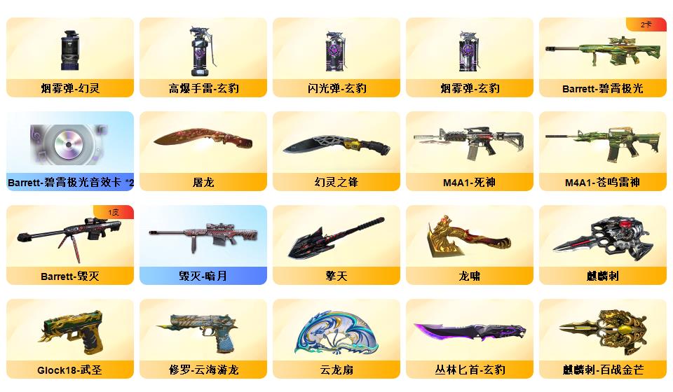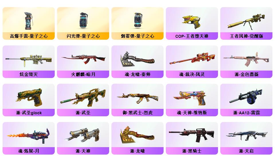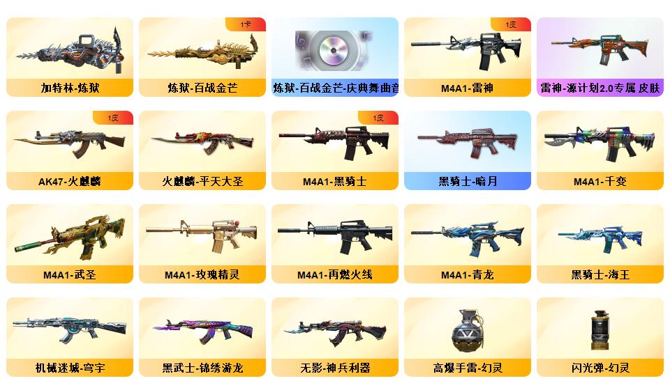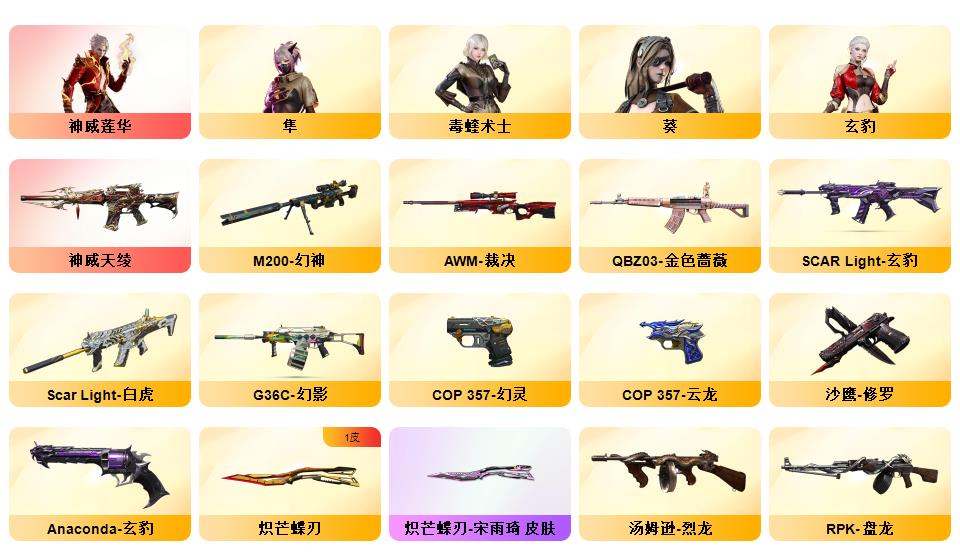 【神威天绫】【神威莲华】【105v】【6盘6烈】G36C-幻影,QBZ03-金色蔷薇,Scar Light-白虎,M4A1-青龙,M200-幻神,死亡之眼,M4A1-黑骑士,加特林-炼狱,雷神-小红,COP 357-幻灵,沙鹰-修罗*6,炽芒蝶刃*2【王者炫金武器】:COP-王者堕天神*2,炫金毁灭【音效卡】:Barrett-碧霄极光音效卡*2,炼狱-百