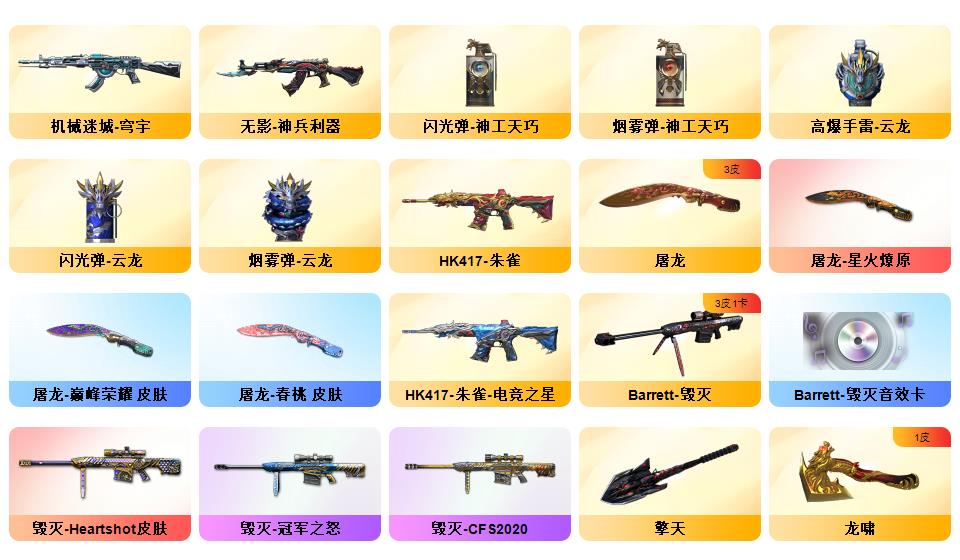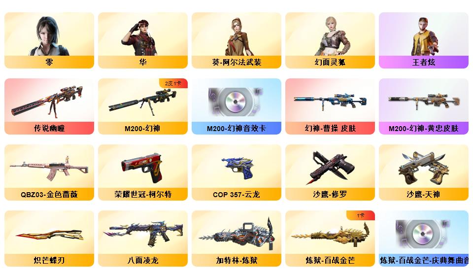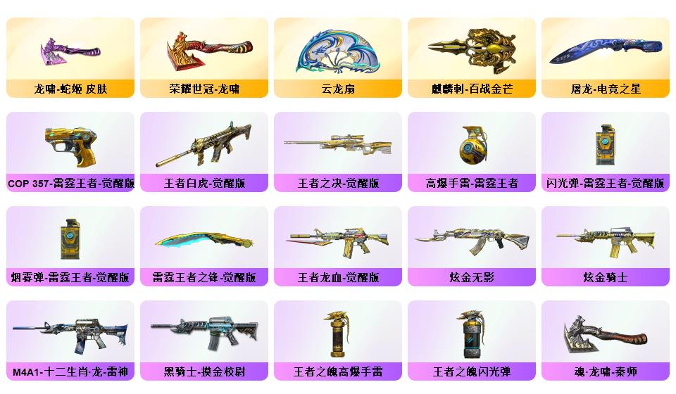 【传说幽瞳】【幻神+幻神黄忠+曹操+幻神音效卡】【八面凌龙】【QBZ03-金色蔷薇】【王者之决-觉醒版/王者龙血-觉醒版/王者白虎-觉醒版/COP 357-雷霆王者-觉醒版/雷霆王者之锋-觉醒版】【COP 357-云龙/沙鹰-天神(2)/沙鹰-修罗(2)/修罗-古蛇迷踪/荣耀世冠-柯尔特】【炽芒蝶刃(2)/屠龙(2)/龙啸/荣耀世冠-龙啸/云龙