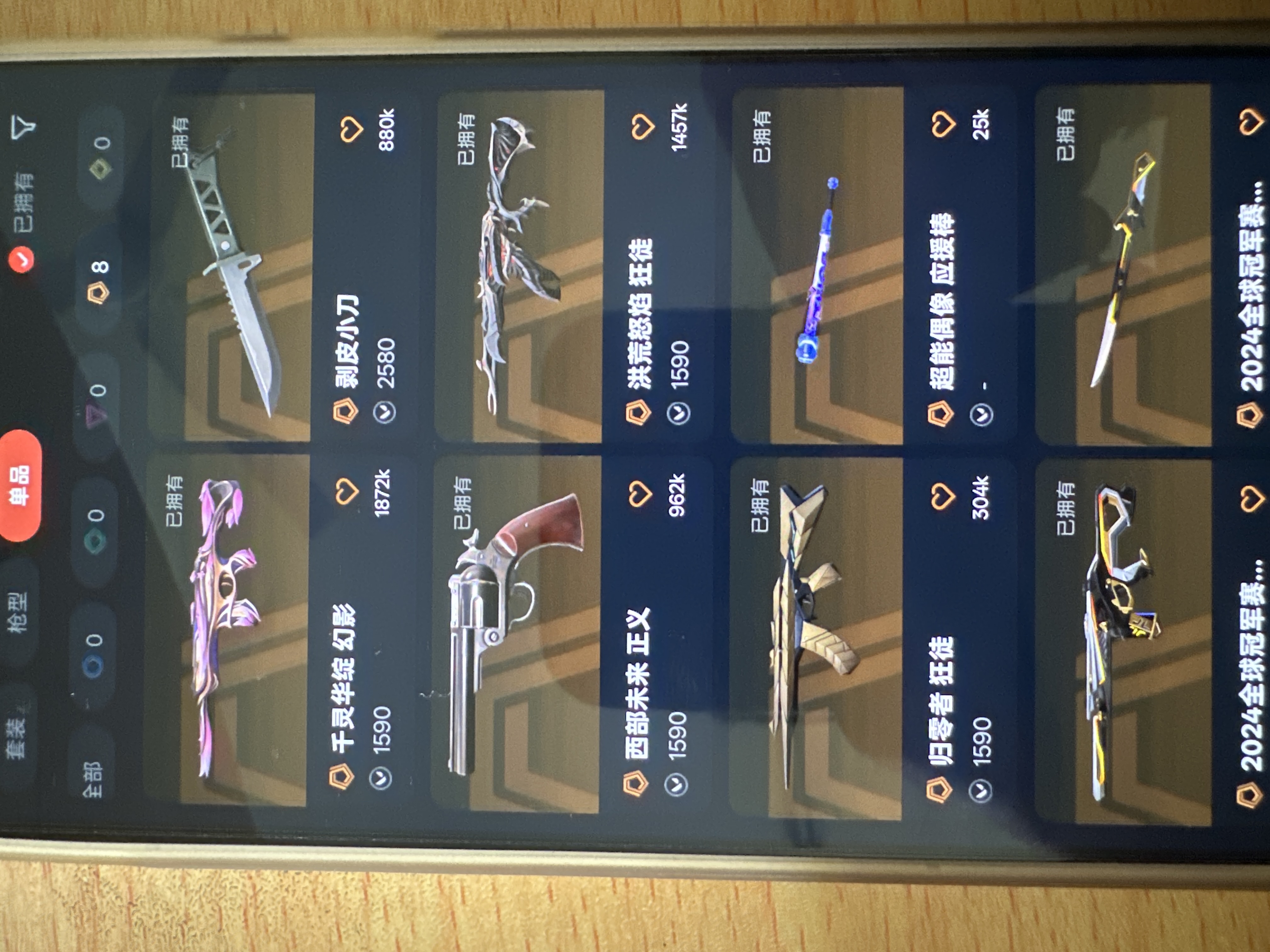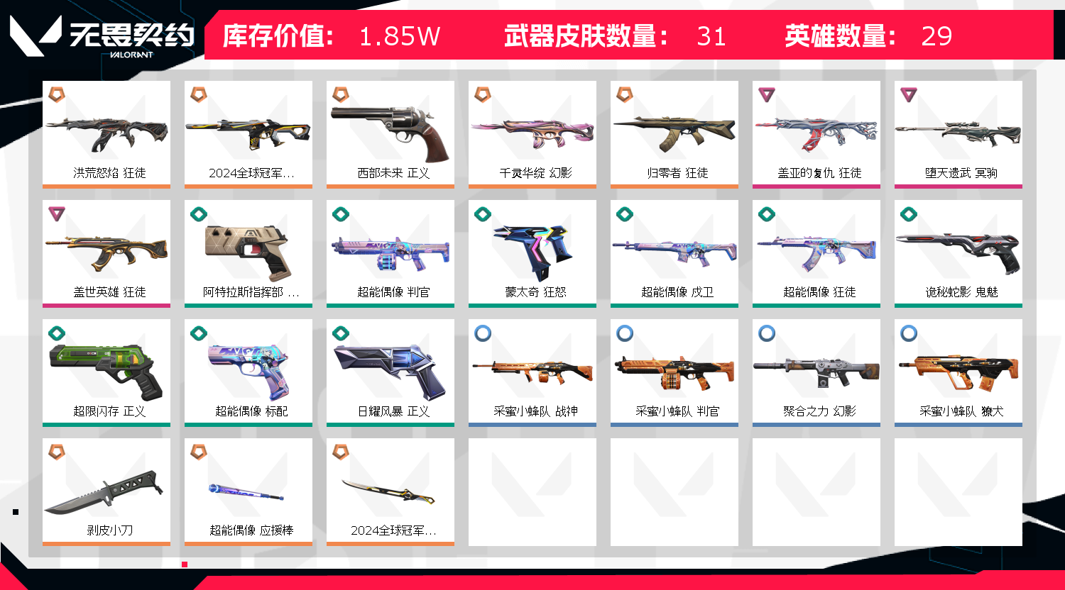 允许 英雄27 武器皮肤数量31;剥皮小刀,盖亚的复仇 狂徒,洪荒怒焰 狂徒,2024全球冠军赛 幻影,堕天遗武 冥驹,西部未来 正义,