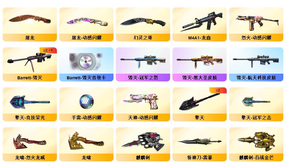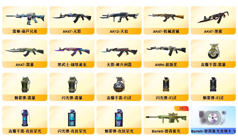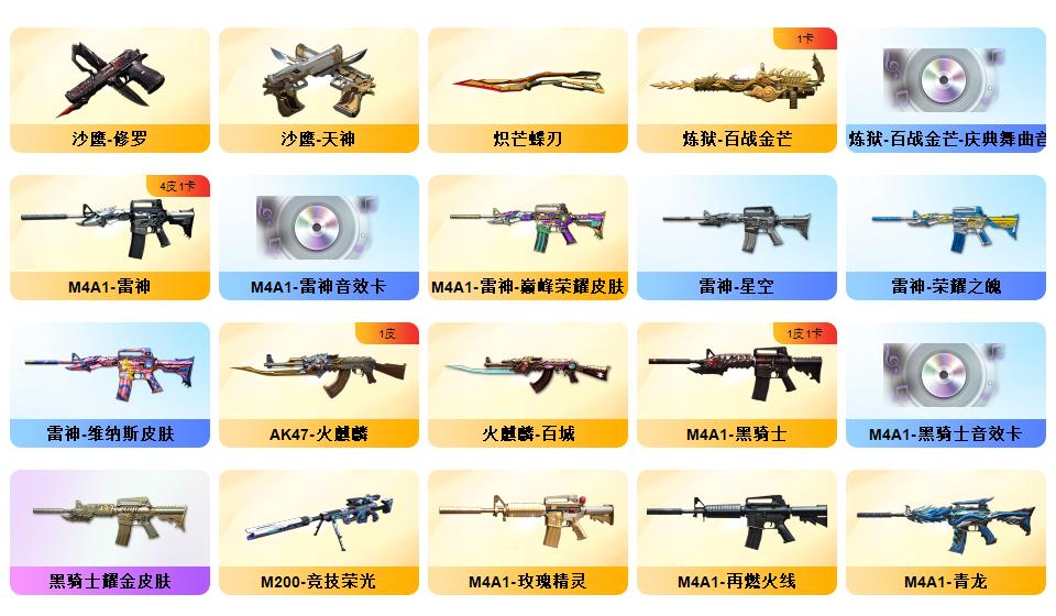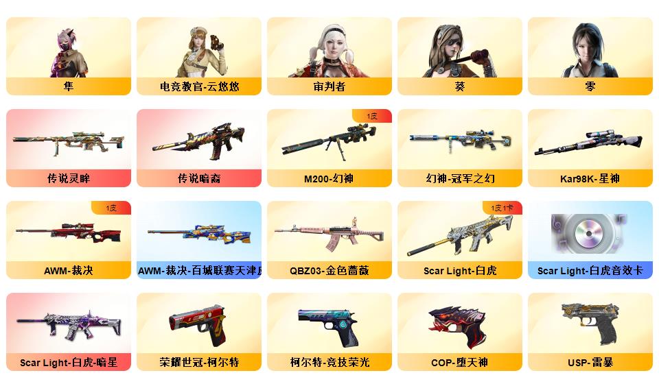 【传说暗裔】【传说灵眸】【M200-幻神,Kar98K-星神】QBZ03-金色蔷薇,Scar Light-白虎,M4A1-青龙*2,,M200-竞技荣光,荣耀世冠-柯尔特,M4A1-黑骑士*2,斯泰尔-蝴蝶,羊驼玩偶,COP-白鲨,USP-雷暴,COP-堕天神,沙鹰-修罗*3,炽芒蝶刃,金刚伞【稀有套装】:竞技荣光套,雷暴套【王者炫金武器】: