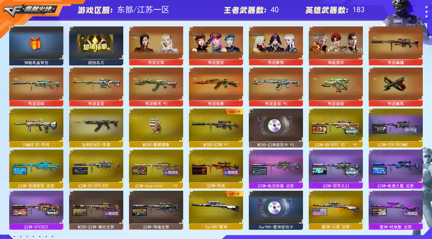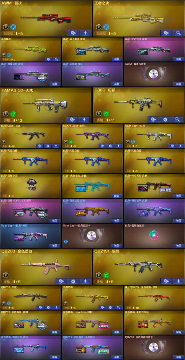 传说女帝+幻神光海+白虎光海+幽瞳神威莲华17传说+雷神珍藏版+金名+大满贯副手29主流+幻神YZK十四皮三件套+星神三件套+裁决三件套+满级八面玲珑卡+G36C幻影/加利尔天袭/法码斯天戎/QBZ191银翼/白虎三件套传奇常旭6皮/QBZ金色蔷薇三件套5皮斗鱼/雷神荣耀/5烈龙➕斯泰尔枪娘暗刃➕异变清道夫蛇影双骄➕5盘龙➕2炼狱➕4蝴蝶刀➕炼狱金翼禅狮➕炼狱泡泡象奇幻宇宙万象➕鲨臂手套➕冠军小刀➕角色生化神威莲华/传说影煞/传说星骇/云悠悠/关小雨/荆棘/玄豹/机械姬/晴雅/星际战将/研/最强爆破鹰/雨墨/等等很多王者四防角色/超核名片/天花板慢慢品鉴/等等具体细节看图;柯尔特-无冕之王,USP-雷暴王者,传说幽冥,柯尔特-冠军之特,炽芒蝶刃,Knife-冠军之刃,传说影煞,