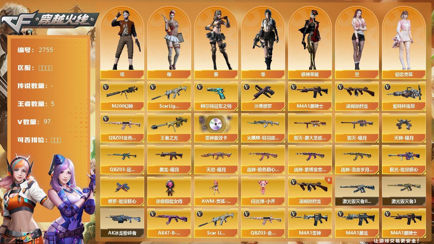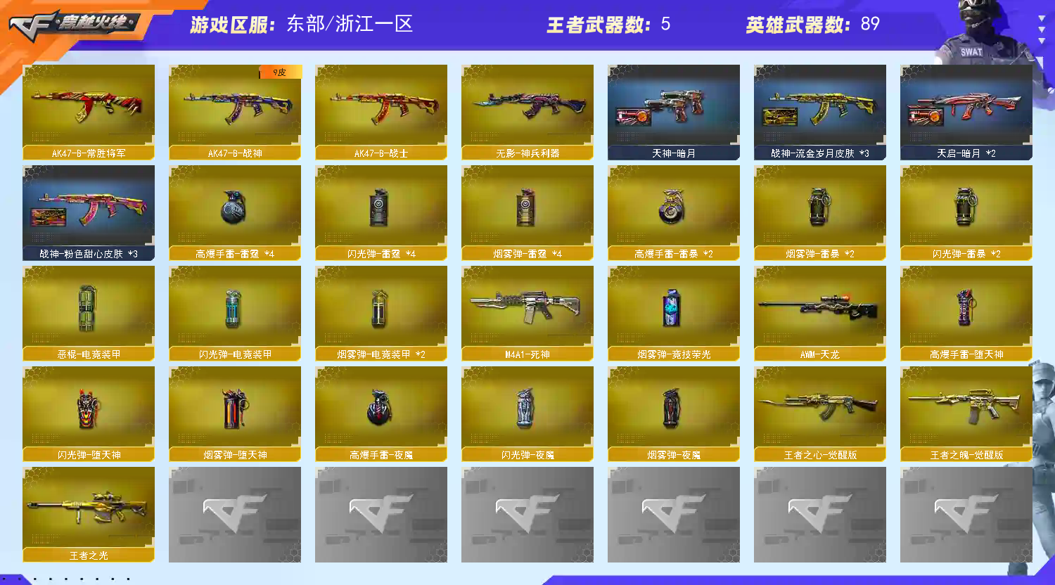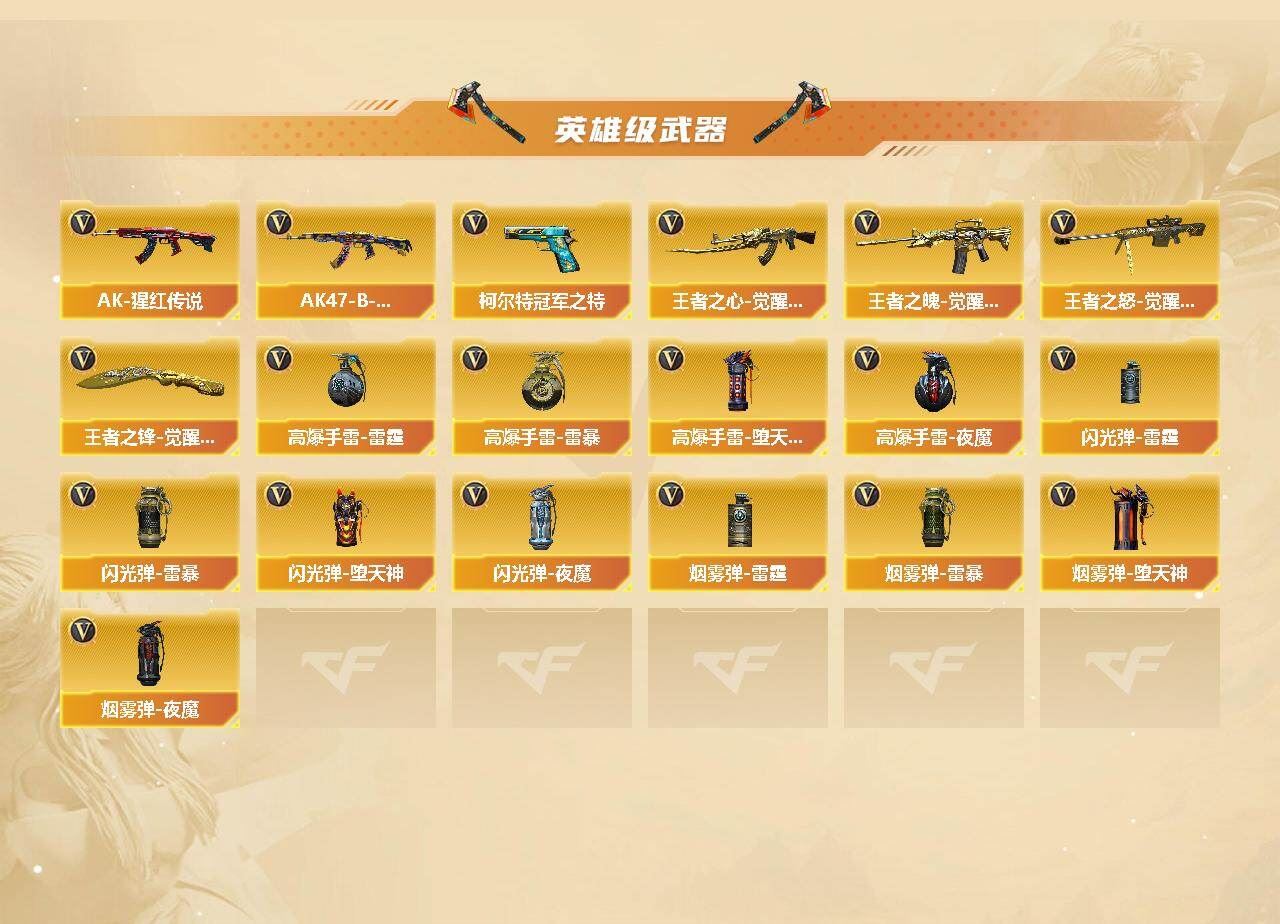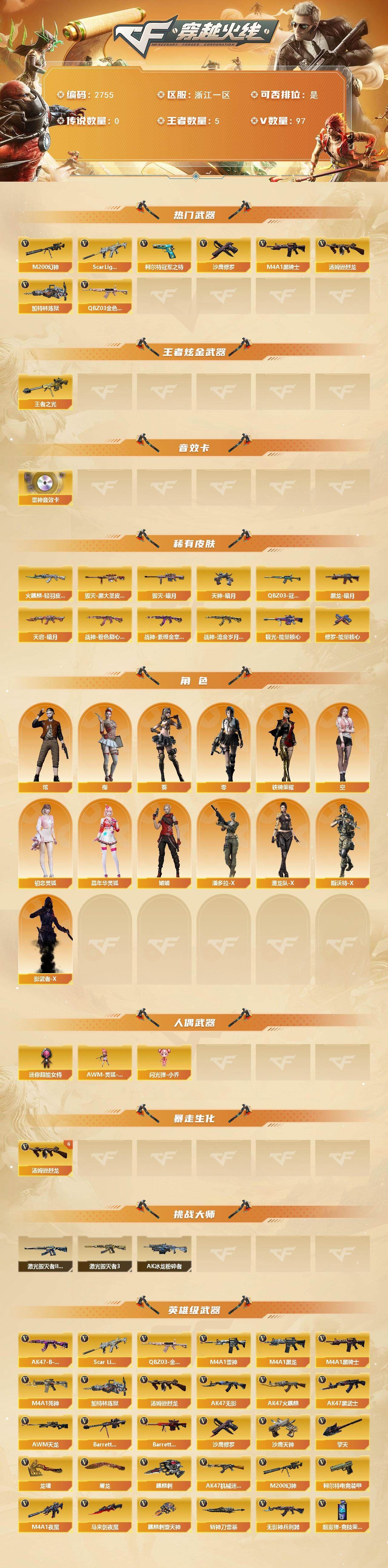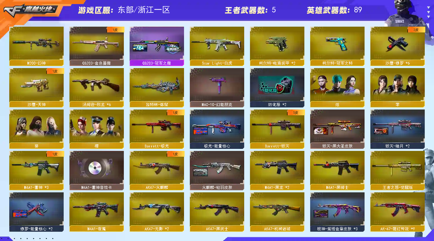【热门武器】:QBZ03-金色蔷薇,Scar Light-白虎,M200-幻神,柯尔特-冠军之特,M4A1-黑骑士,汤姆逊-烈龙*6,加特林-炼狱,沙鹰-修罗*6【王者炫金武器】:王者之光【音效卡】:M4A1-雷神音效卡【皮肤】:QBZ03-冠军之薇,火麒麟-轻羽皮肤,毁灭-暗月*2,毁灭-黑大圣皮肤,黑龙-暗月,天启-暗月*2,战神-粉色甜心皮肤*3,战神-紫绶金章皮肤*3,战神-流金岁月皮肤*3,极光-能量核心,修罗-能量核心*2,天神-暗月【角色】:零,葵,樱,炫,空,初恋灵狐,嘉年华灵狐,娟娟,潘多拉-X,潜龙队-X,斯沃特-X,铁骑荣耀,影武者-X【人偶武器】:AWM-灵狐-15周年嘉年华,闪光弹-小乔,迷你超能女侍【挑战大师】:AK47-冰龙粉碎者,激光毁灭者III-白马银枪,激光毁灭者III【英雄级武器】:AK47-火麒麟,M4A1-黑龙*2,M4A1-雷神*3,M4A1-黑骑士,AK47-无影*2,M4A1-死神,AK47-黑武士,AK47-机械迷城,Scar Light-白虎,M4A1-夜魔,无影-神兵利器,QBZ03-金色蔷薇,王者之心-觉醒版,王者之魄-觉醒版,AK-47-猩红传说*9,AK47-B-战神,AK47-B-常胜将军,AWM-天龙,Barrett-毁灭,Barrett-极光,M200-幻神,王者之怒-觉醒版,加特林-炼狱,汤姆逊-烈龙*6,沙鹰-修罗*6,沙鹰-天神,柯尔特-冠军之特,柯尔特-电竞装甲*2,屠龙*4,龙啸,麒麟刺-堕天神,马来剑-夜魔,擎天,麒麟刺,斩神刀-雷暴,王者之锋-觉醒版,高爆手雷-雷霆*4,高爆手雷-雷暴*2,高爆手雷-堕天神,高爆手雷-夜魔,闪光弹-雷霆*4,闪光弹-雷暴*2,闪光弹-堕天神,闪光弹-夜魔,烟雾弹-雷霆*4,烟雾弹-雷暴*2,烟雾弹-堕天神,烟雾弹-夜魔,烟雾弹-竞技荣光【道具】:BS战队炫彩背包,云海游龙炫彩背包,炫彩背包,超级背包*2,变异宝贝,夺命之镰,防化服,金色流光-枪王排位*2,星辰流光-枪王排位,巅峰赛先锋-金色流光,枪王排位28赛季金色流光,电玩兔兔表情,循环实验表情,EP战队名片,防弹头盔*3,防弹衣*3,C4工具钳,手雷包*3【特殊枪械】:1白虎,1黑骑士,6烈龙,1炼狱,;柯尔特-冠军之特,QBZ03-金色蔷薇,M200-幻神,Scar Light-白虎,