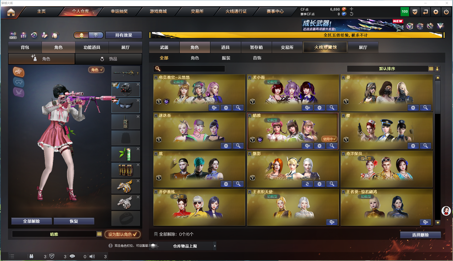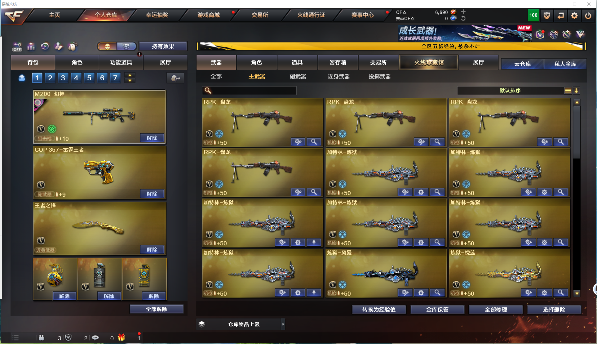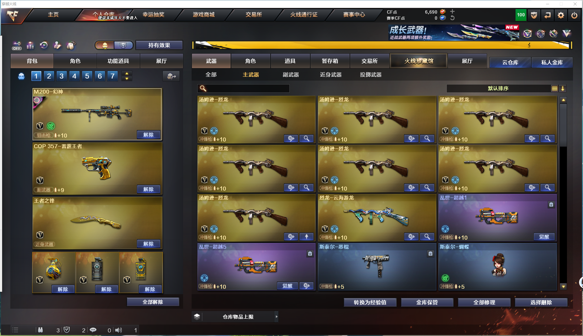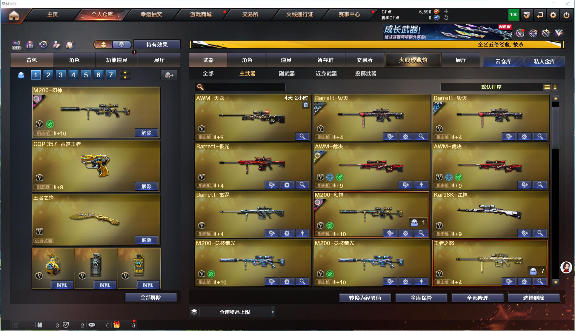幻神宠儿+皮肤、裁决+皮肤、星神、晴雅、雷暴套、雷霆套、6烈+斯泰尔、6盘、白虎、惊涛骇浪;USP-雷暴,电竞教官-云悠悠,晴雅,RPK-盘龙,QBZ03-金色蔷薇,M200-幻神,Kar98K-星神,