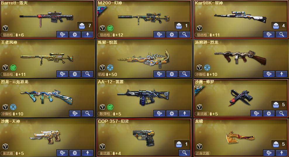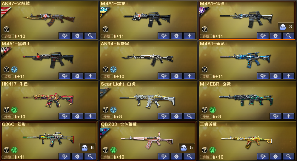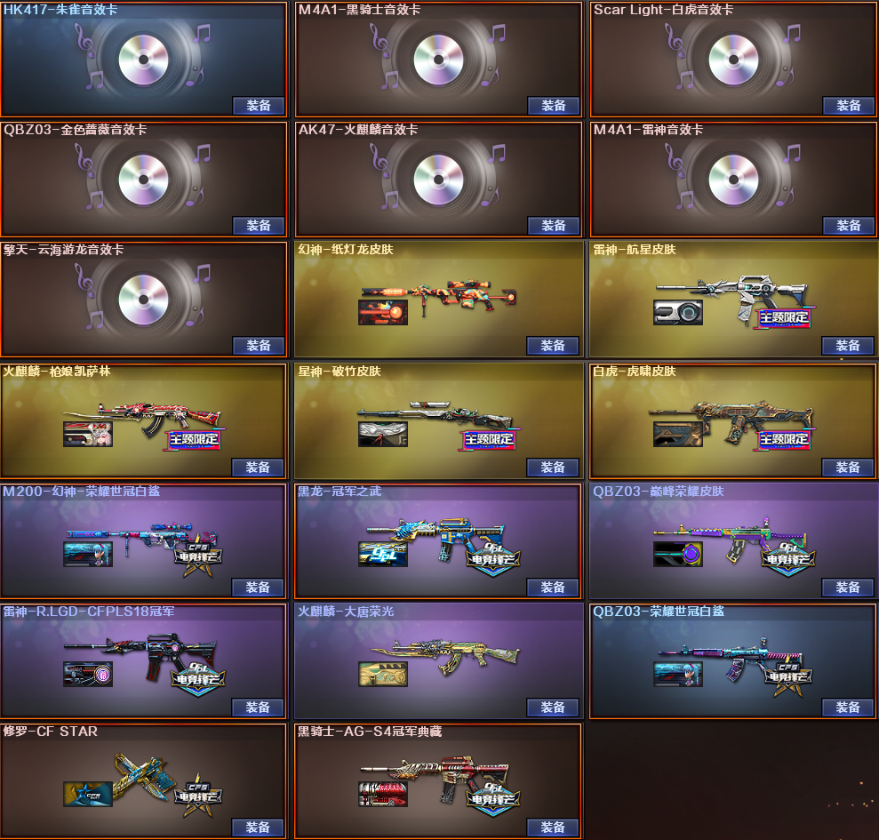 爆破质量号✅幻神4件套✅炽芒蝶刃✅星神破竹✅白虎3件套✅QBZ4件套✅幻影雷神4件火麒麟4件套 稀有武器:M200幻神、98K星神、炽芒蝶刃、G36C幻影、M14玄武、SL白虎、HK朱雀、M4青龙、QBZ金色蔷薇、火麒麟、黑龙、雷神、黑骑士、超新星、毁灭、烈龙、烈龙云海游龙、A12雷霆、修罗、天神、COP幻灵、龙啸、麒麟刺、幻灵之锋X2、擎天云海游龙、赤狱骑士、激光毁灭者、试炼破坏者、巡航者、黄金猫猫手套白鲨 稀有角色:鹰、奇洋探员、王者潘多拉(四防:生化背包变更+狩猎本能+生化觉醒狂暴化+佣兵觉醒无需换弹)、王者影豹(四防:减少闪光效果+免疫队友炸弹伤害+减少掉落伤害+副武器自动装弹)、云海玲珑、暗夜X、飞虎队X、荆棘玫瑰、龙儿、圣诞潘多拉X、新娜塔莎 音效卡:HK朱雀音效卡、白虎音效卡、QBZ金色蔷薇音效卡、黑骑士音效卡、火麒麟音效卡、雷神音效卡、擎天云海玲珑音效卡 稀有皮肤:幻神纸灯龙皮肤/荣耀世冠白鲨皮肤、星神破竹皮肤、白虎虎啸皮肤、QBZ金色蔷薇巅峰荣耀皮肤/荣耀世冠白鲨皮肤、火麒麟枪娘凯萨林皮肤/大唐荣光皮肤、黑龙冠军之武皮肤、雷神R.LGD-CFPLS18冠军皮肤/航星皮肤、修罗CFstar皮肤、黑骑士AG-S4冠军典藏皮肤 王者炫金武器:王者芳薇、王者风神、炼狱悦蓝 投掷套装:幻灵套X3、高爆手雷SS、双生雷恶棍、生化手雷;炽芒蝶刃,QBZ03-金色蔷薇,G36C-幻影,M200-幻神,Scar Light-白虎,Kar98K-星神,