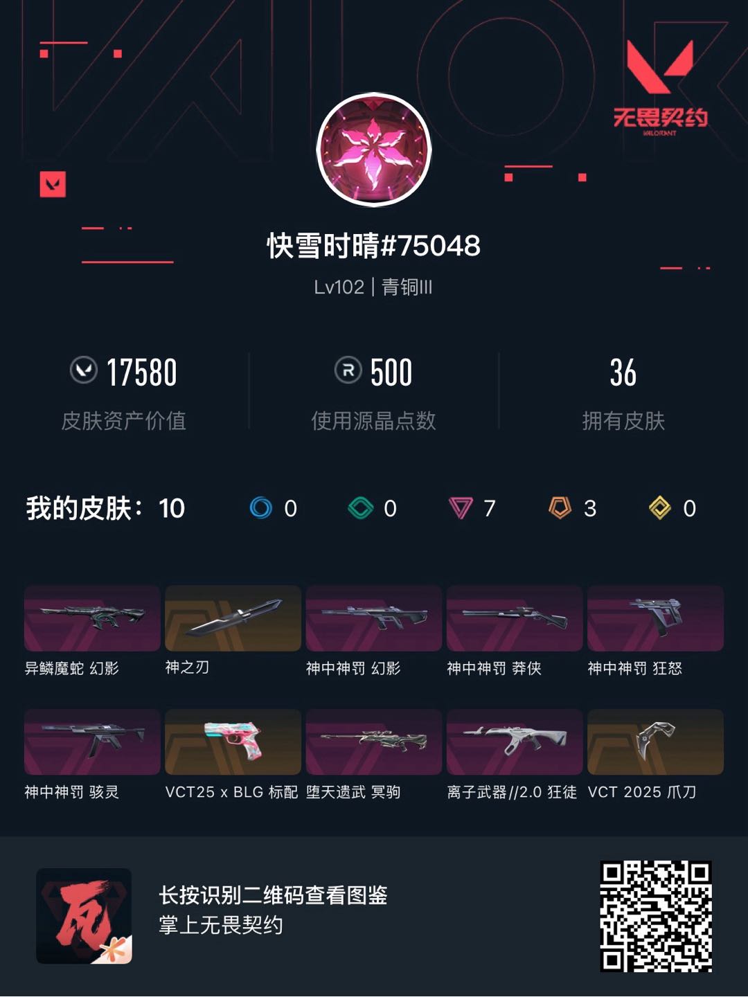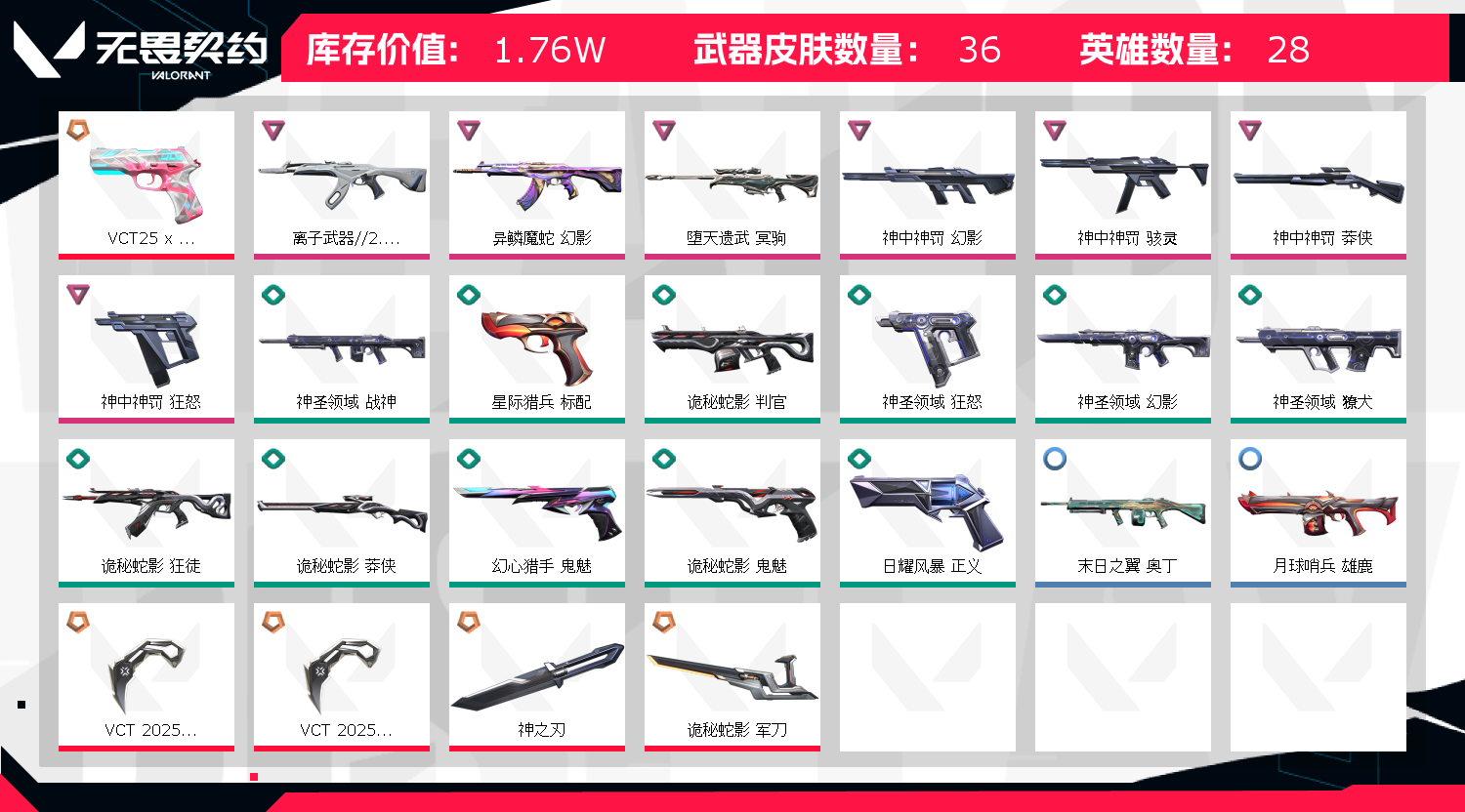 首页 > 租号大厅 > 无畏契约-wegame > wegame/wegame > 25vct爪刀🔥神之刃🔥神中神罚全套🔥弃王大狙🔥异鳞魔蛇🔥离子ak🔥25BLG火