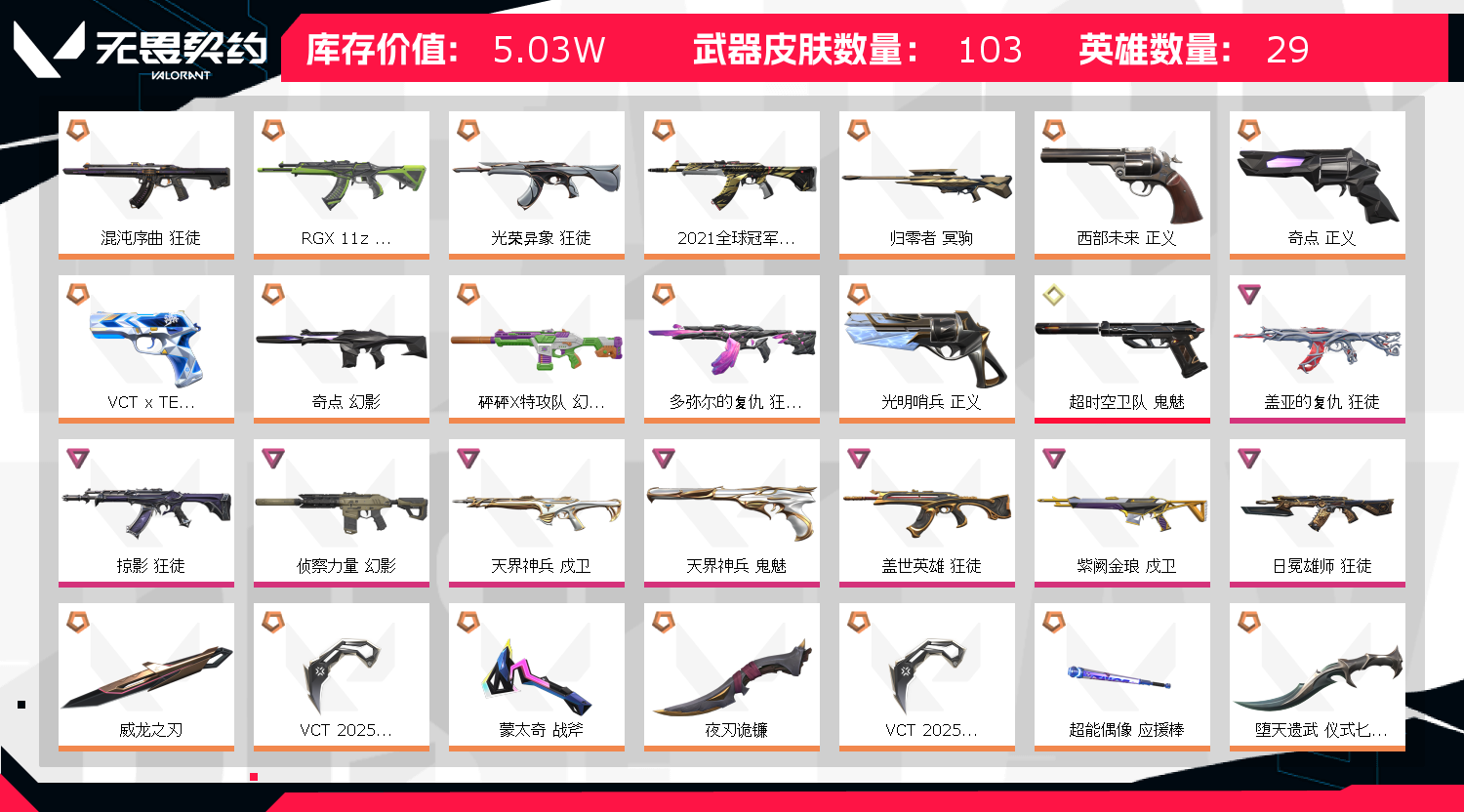 可排位 掠夺奇点 超时空鬼魅 光荣 马年 侦查 天界 21冠 归零 混沌 盖世 侦察 盖亚;威龙之刃,VCT 2025 爪刀,盖亚的复仇 狂徒,掠影 狂徒,侦察力量 幻影,RGX 11z Pro 狂徒,天界神兵 戍卫,