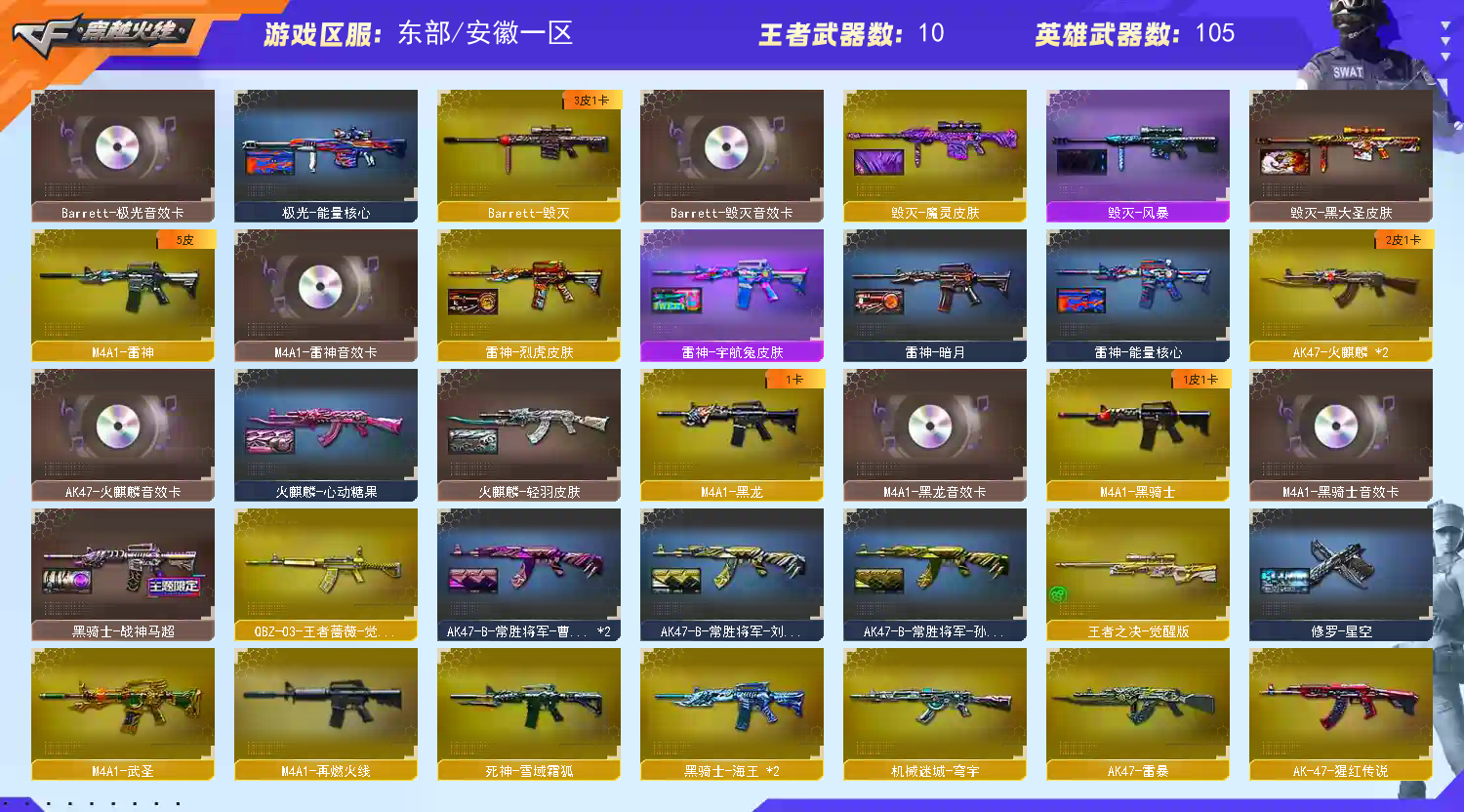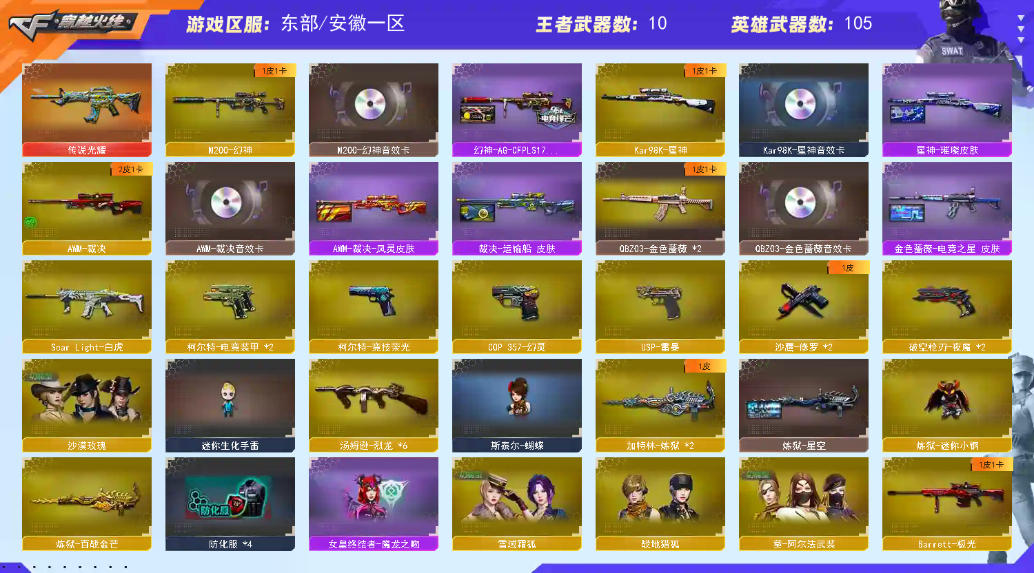 【M200-幻神+音效卡+幻神-AG-CFPLS17+星神-璀璨】【Kar98K-星神+音效卡】【传说光耀】【ScarLight-白虎】【QBZ03-金色蔷薇+音效卡】【生化 2炼狱 6烈龙 迷你小钢 蝴蝶 死亡之眼】【裁决+音效卡+运输船+凤灵】【Barrett-毁灭+音效卡】【极光+音效卡】【雷暴套】【AK47-火麒麟+音效卡】【黑龙+音效卡】【M4A1-雷神+音效卡】【黑骑士+音效卡+黑骑士-马超】【王者之心 王者之势 王者火魄 王者之决 王者雷怒】【死神】【11手枪 修罗*2 usp雷暴 cop幻灵 】【15近战 屠龙 龙啸*2 擎天 斩神刀雷暴 王者之刺 王者冰锋 王者之击】【手雷 雷暴雷 堕天神 电竞装甲】【四防 沙漠玫瑰】【幻神音效卡 Kar98K-星神音效卡 裁决音效卡 Barrett-毁灭音效卡 极光音效卡 AK47-火麒麟音效卡】;USP-雷暴,沙漠玫瑰,QBZ03-金色蔷薇,M200-幻神,Scar Light-白虎,Kar98K-星神,