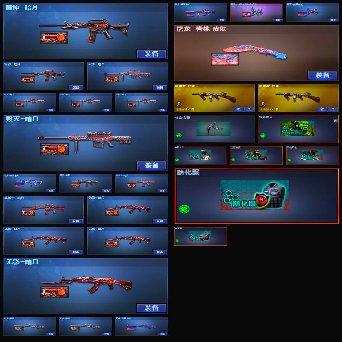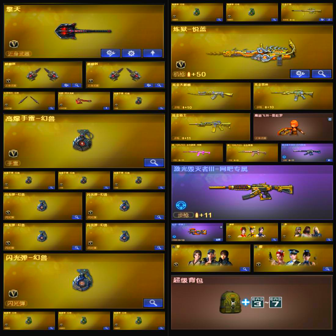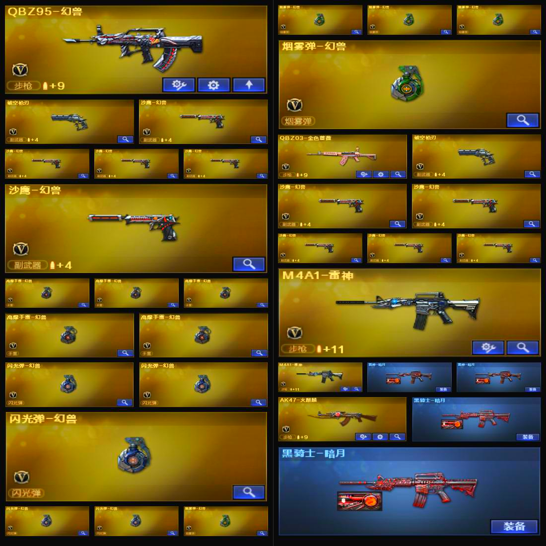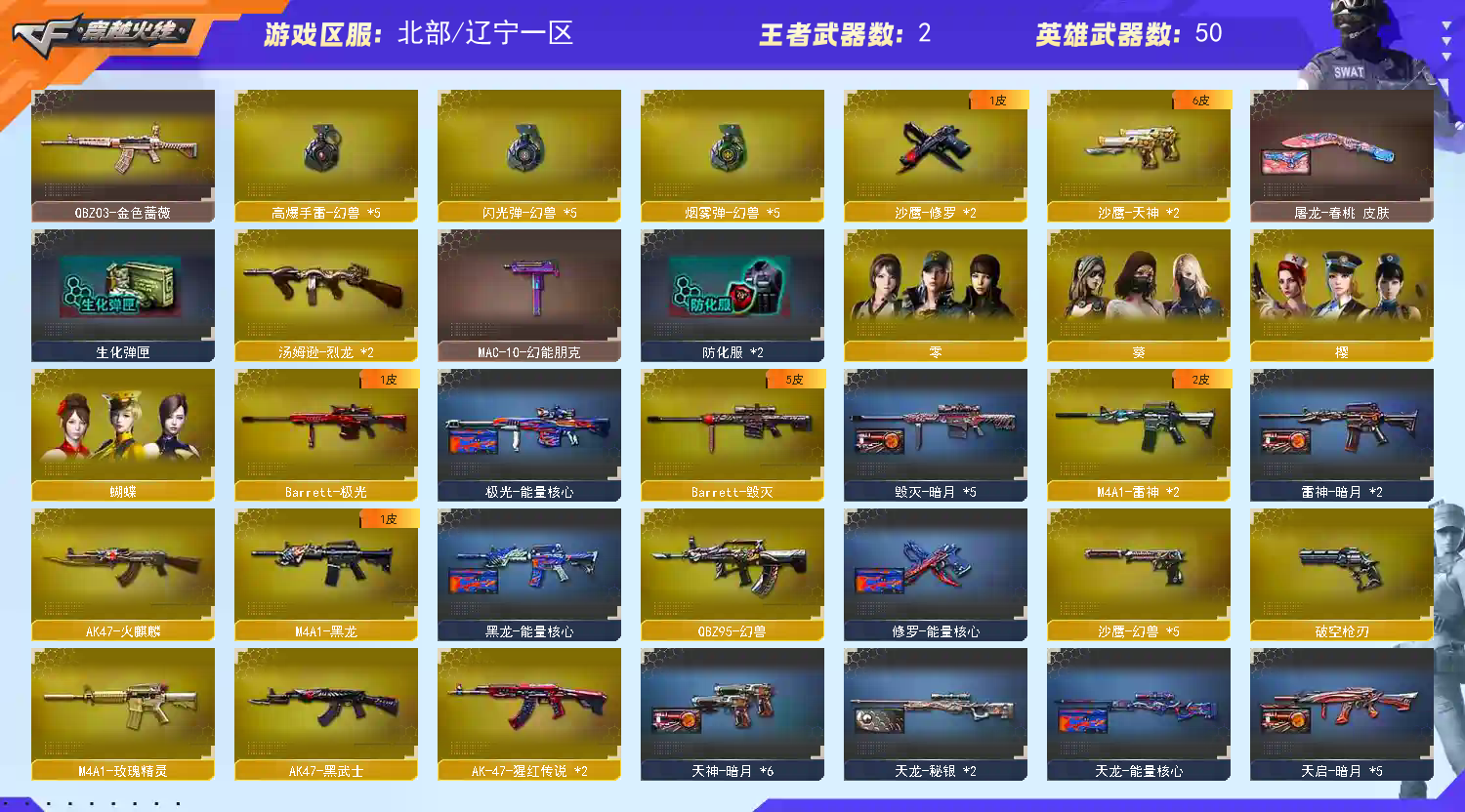 【热门武器】:QBZ03-金色蔷薇,沙鹰-修罗,汤姆逊-烈龙,高爆手雷-幻兽【王者炫金武器】:王者之怒,炫金火麒麟,炫金骑士,炫金黑龙,炫金雷神,炼狱-悦蓝【皮肤】:毁灭-暗月,黑骑士-暗月,天龙-秘银,天龙-能量核心,天神-暗月,屠龙-春桃,雷神-暗月,毁灭-英雄计划,黑龙-能量核心,黑龙-暗月,无影-暗月,死神-秘银,天启-暗月,极光-能量核心,修罗-能量核心,修罗-15周年嘉年华【角色】:蝴蝶,葵,零,铁骑荣耀,樱,玫瑰花神,潘多拉-X,雪莉杨-摸金校尉,影武者-X【挑战大师】:冰龙粉碎者-白马银枪,激光毁灭者III-白马银枪【英雄级武器】:AK47-火麒麟,AK47-黑武士,AWM-天龙,Barrett-毁灭,Barrett-极光,龙啸,M4A1-黑龙,M4A1-雷神,M4A1-玫瑰精灵,女皇利刃-幻兽,QBZ95-幻兽,擎天,麒麟刺,沙鹰-修罗,沙鹰-天神,沙鹰-幻兽【道具】:亚洲杯纪念炫彩背包,战舰背包,炫彩背包,超级背包,救世主-黑桃战神,黄金生化钩,绿色巨人,灵魂忍者,迷雾幽灵,夺命之镰,防化服,金色流光-枪王排位,星辰流光-枪王排位,枪王排位29赛季金色流光,CFPL选手表情-第1套,C4-红龙;QBZ03-金色蔷薇,