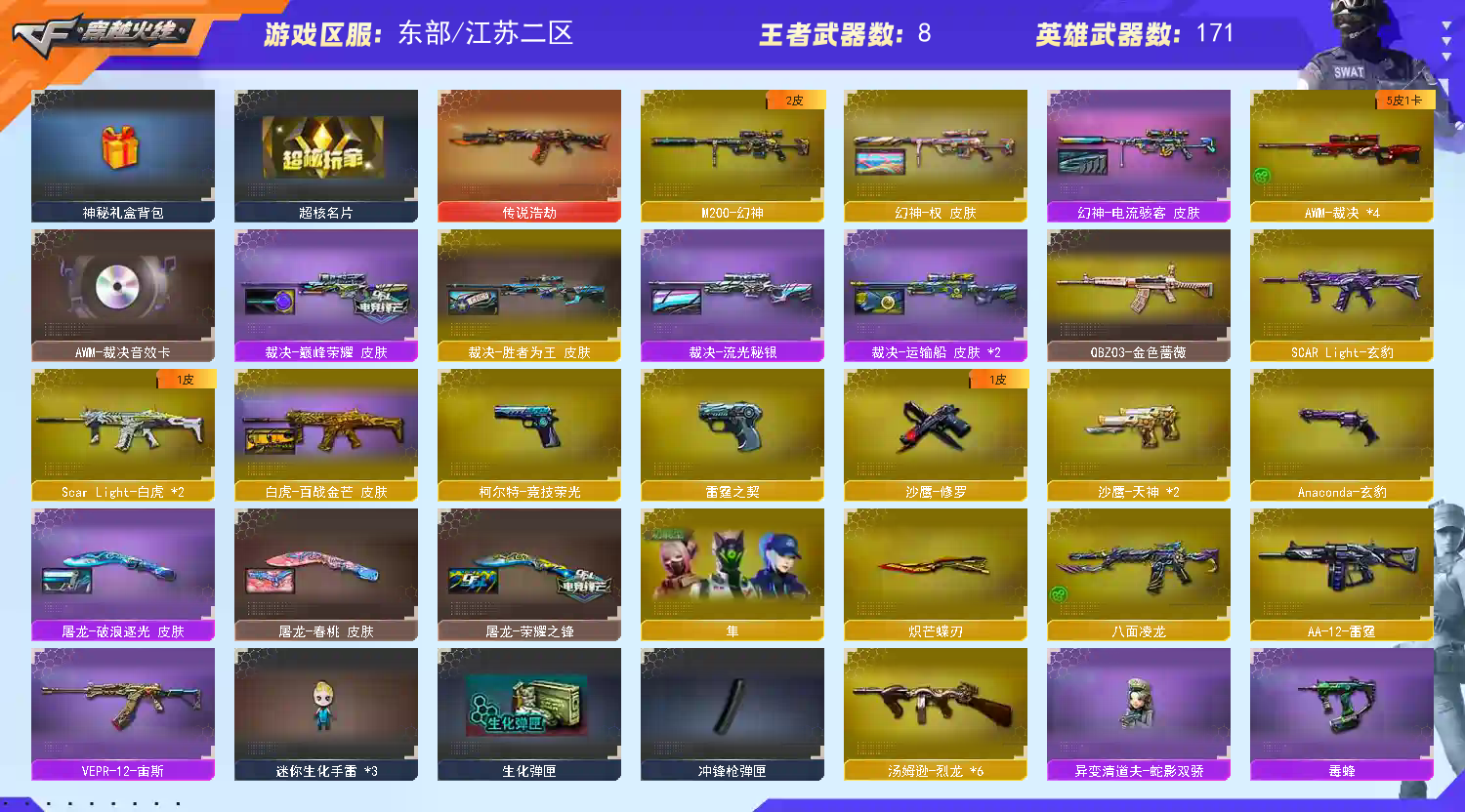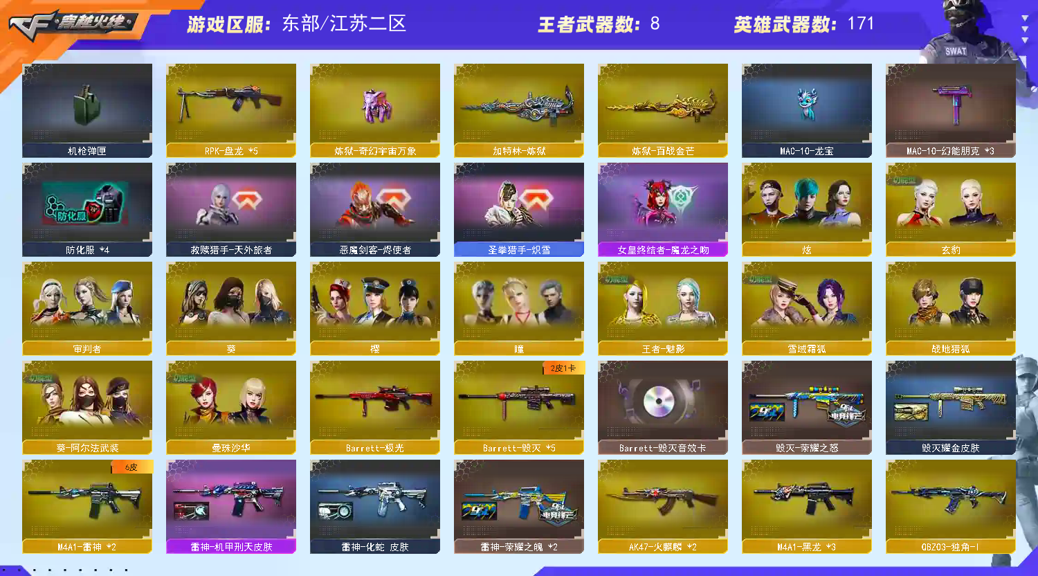生化:5列龙➕蛇影双娇➕斯太尔蝴蝶 5盘龙➕奇幻泡泡像➕炼狱(赋予奇幻泡泡像皮肤)八面玲珑➕裁决(三件套)➕6步枪➕时空猎手 救世主:宙斯套装 超核名片➕超核喷涂➕金色昵称 挑战:168套装 无尽挑战:轻松单刷50关 趣味枪械:AK47-牛牛贵族金、王者猛虎、猫猫cop357、王者-C.A.T、王者汪汪-巴雷特➕此类枪械超百万点券、账号一旦被封将报警向平台索要联系方式并且联系律师起诉按照账号充值原价赔偿且永封➕黑名单 更新:幻神(幻神-权皮肤)龙啸(音效卡)紫凛皮肤、传说浩劫、G36C音效卡、屠龙-定军杨威皮肤;炽芒蝶刃,隼,RPK-盘龙,QBZ03-金色蔷薇,M200-幻神,Scar Light-白虎,传说浩劫,