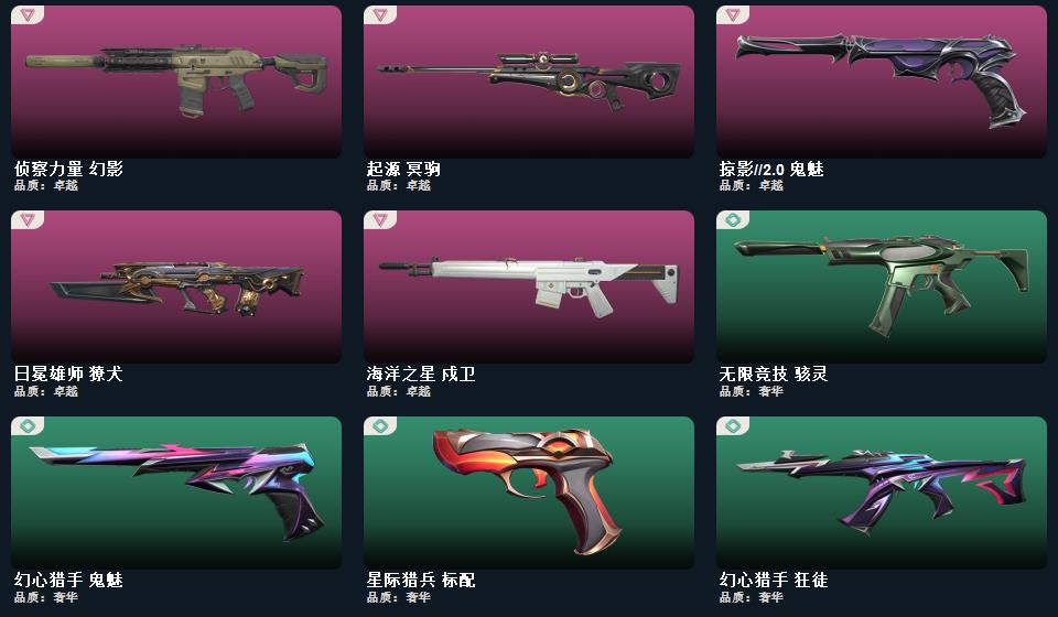 千灵华绽正义 碎心裂刃 剥皮小刀 噬影者狂徒 星际猎兵短剑 混沌序曲2.0幻影 颗秒狂徒 上古龙炎狂徒 海洋之星戍卫 起源冥狙 日冕雄狮獠犬 掠影2.0鬼魅 侦查力量幻影
