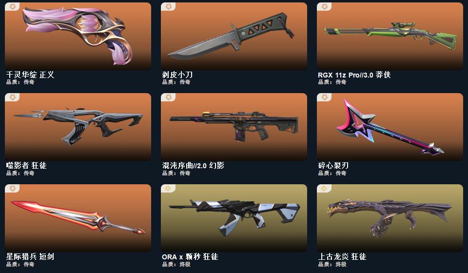 千灵华绽正义 碎心裂刃 剥皮小刀 噬影者狂徒 星际猎兵短剑 混沌序曲2.0幻影 颗秒狂徒 上古龙炎狂徒 海洋之星戍卫 起源冥狙 日冕雄狮獠犬 掠影2.0鬼魅