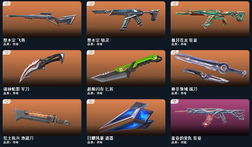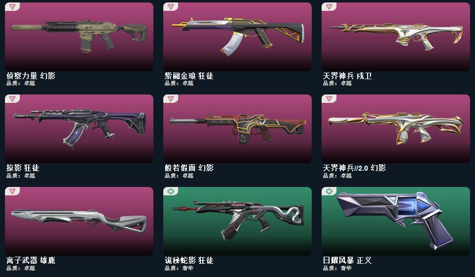 诡秘蛇影军刀 偃月苍龙狂徒 盖亚的复仇狂徒 侦查力量幻影 紫阙金琅狂徒 般若假面幻影 掠影狂徒