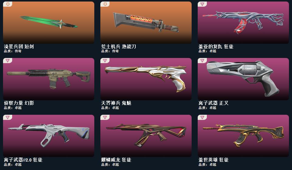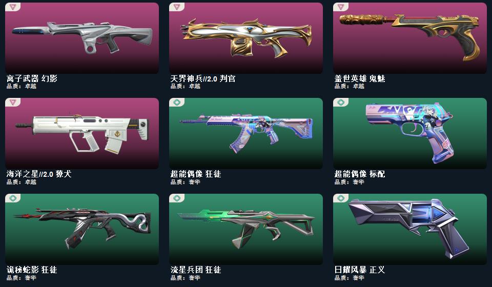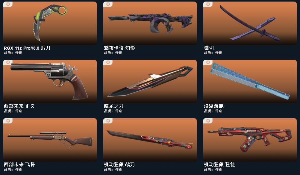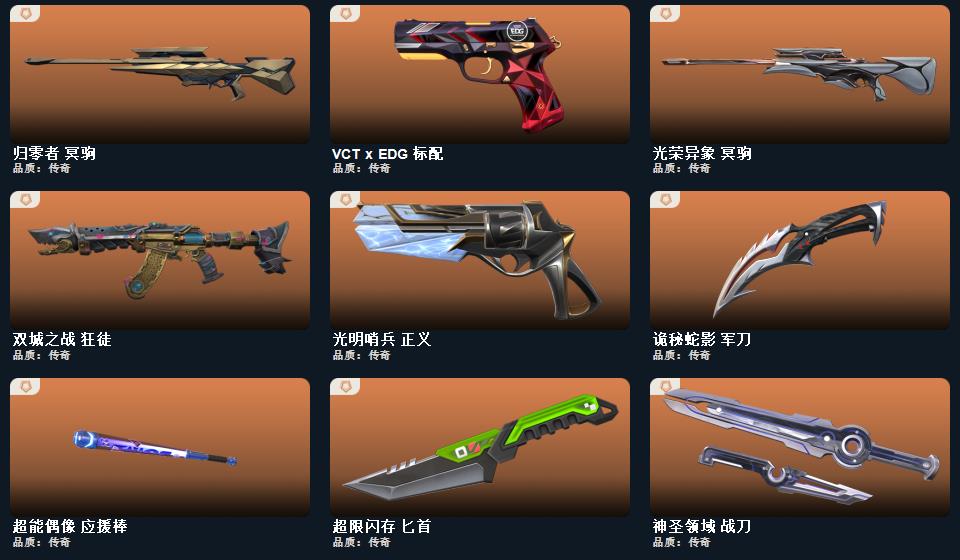 光荣异象冥狙 诡秘蛇影军刀 神圣领域战刀 西部未来飞将 双城之战狂徒 黯夜怪谈幻影 机动狂飙狂徒 盖世英雄狂徒 离子武器正义