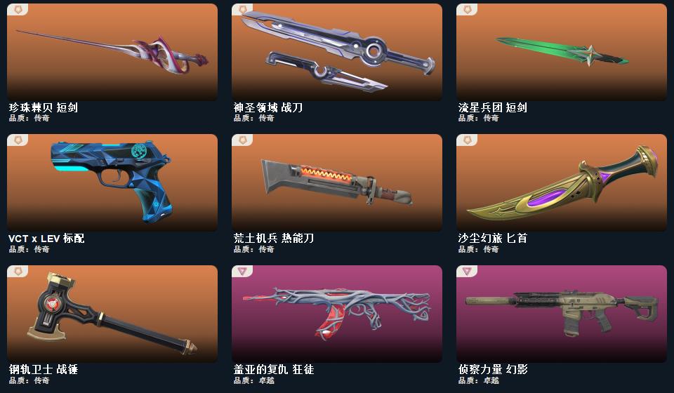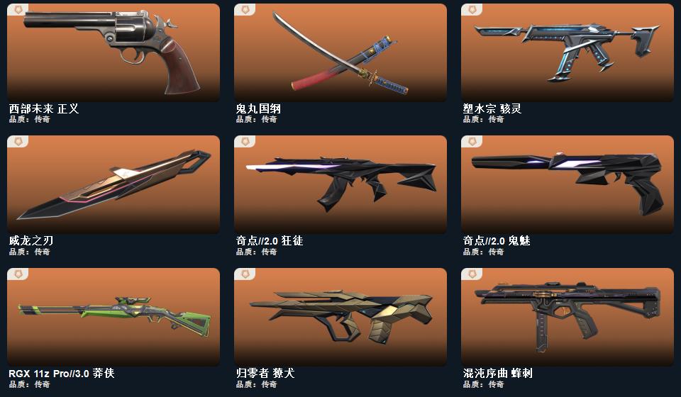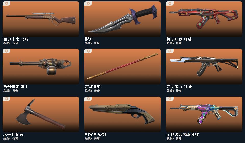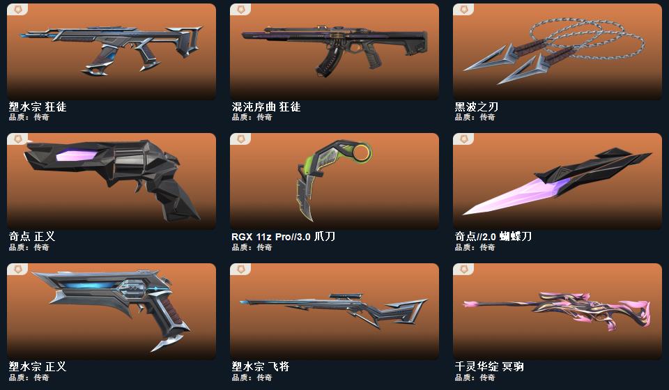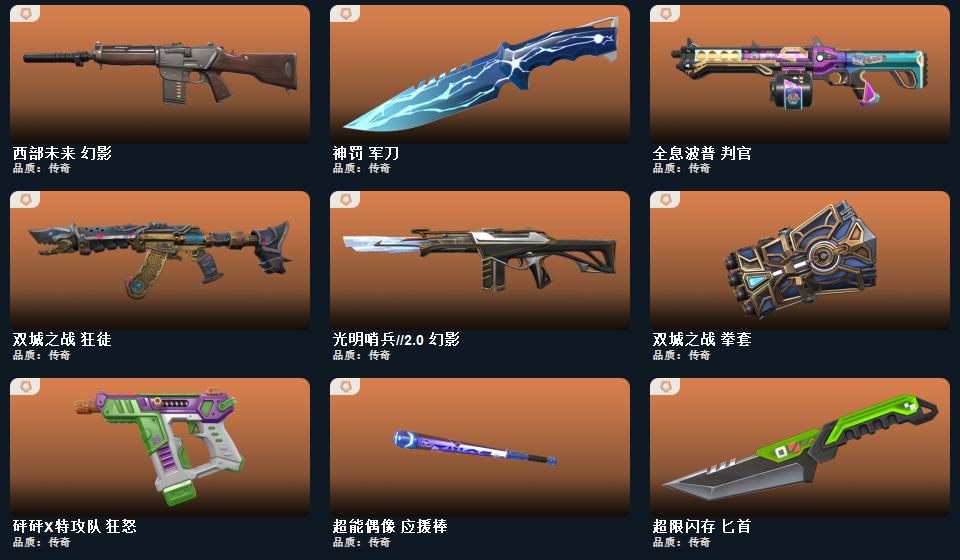西部未来套装,双城之战套装,塑水宗套装,奇点2.0套装,掠影套装, 未来开拓者 双城之战-拳套 黑波之刃 奇点//2.0-蝴蝶刀 影刃 神圣领域-战刀,荒土机兵-热能刀,神罚-军刀,超限闪存-匕首,超能偶像-应援棒,流星兵团-短剑,珍珠棘贝-短剑,钢轨卫士-战锤,沙尘幻旅-匕首,鬼丸国纲,RGX-11z-Pro//3.0-爪刀,定海神珍,威龙之刃, 西部未来-幻影,西部未来-奥丁,西部未来-飞将,西部未来-正义, 双城之战-狂徒,塑水宗-骇灵,塑水宗-狂徒,塑水宗-飞将,塑水