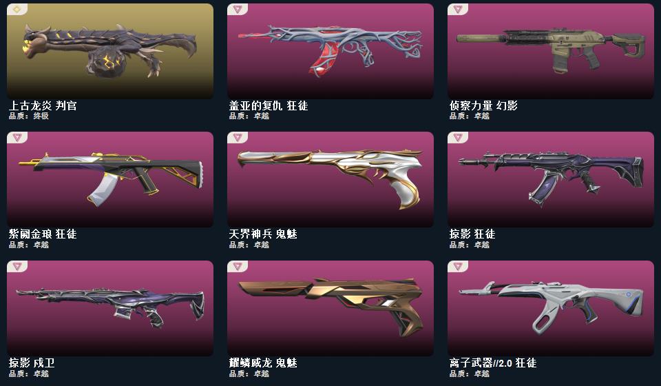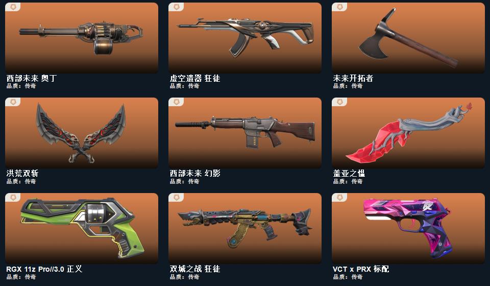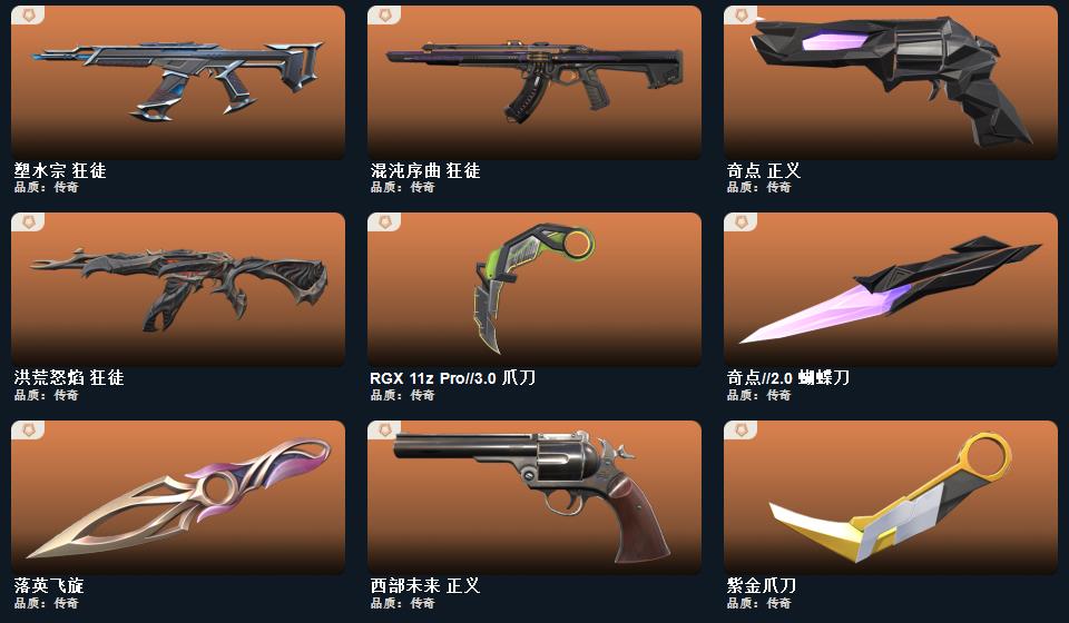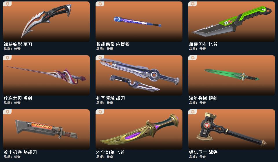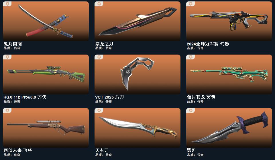 威龙之刃 未来开拓者 鬼丸国纲 RGX-11z-Pro//3.0-爪刀 影刃 诡秘蛇影-军刀,神圣领域-战刀,VCT-2025-爪刀,荒土机兵-热能刀,超限闪存-匕首,超能偶像-应援棒,流星兵团-短剑,珍珠棘贝-短剑,钢轨卫士-战锤,沙尘幻旅-匕首,落英飞旋,洪荒双斩,奇点//2.0-蝴蝶刀,紫金爪刀,天玄刀,盖亚之愠, 西部未来-幻影,西部未来-奥丁,西部未来-飞将,西部未来-正义,般若假面//2.0-狂徒,般若假面//2.0-獠犬,般若假面//2.0-战神,般若假面//2
