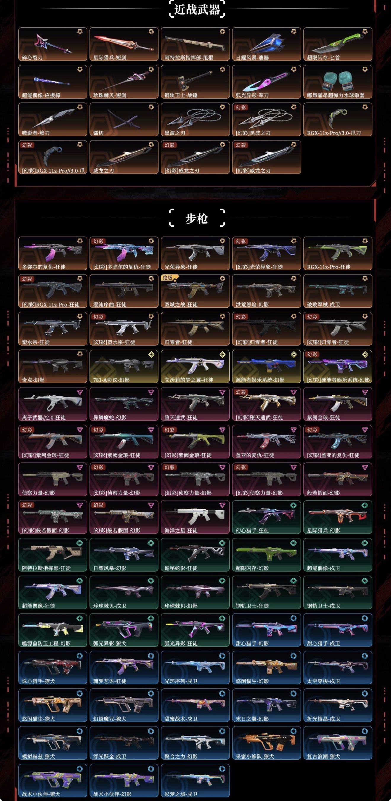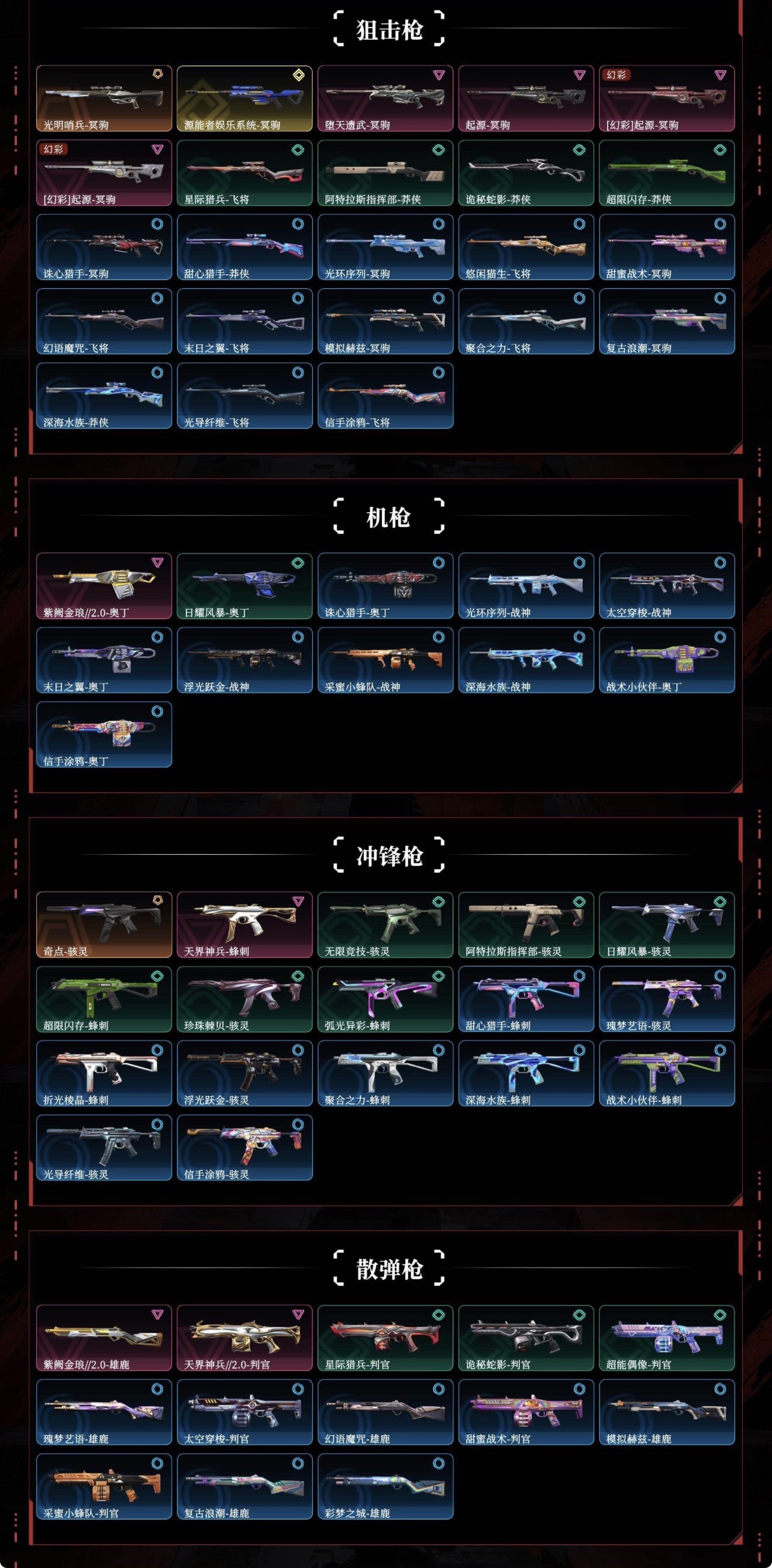 多弥尔的复仇-狂徒,光荣异象-狂徒,RGX-11z-Pro-狂徒,混沌序曲-狂徒,双城之战-狂徒,洪荒怒焰-幻影,破败军械-戍卫,塑水宗-狂徒,归零者-狂徒,奇点-幻影,781-A协议-幻影,艾沃莉的梦之翼-狂徒,源能者娱乐系统-幻影,离子武器//2.0-狂徒,异鳞魔蛇-幻影,堕天遗武-狂徒,紫阙金琅-狂徒,盖亚的复仇-狂徒,侦察力量-幻影,般若假面-幻影,海洋之星-狂徒,幻心猎手-狂徒,星际猎兵-幻影,阿特拉斯指挥部-狂徒,日耀风暴-幻影,诡秘蛇影-狂徒,超限闪存-幻影,超能偶像-戍卫,超能偶像-狂徒,珍珠棘贝-戍卫,珍珠棘贝-幻影,钢轨卫士-狂徒,钢轨卫士-戍卫,噬源兽防卫工程-幻影,弧光异彩-獠犬,弧光异彩-狂徒,甜心猎手-幻影,甜心猎手-戍卫,诛心猎手-獠犬,瑰梦艺语-狂徒,光环序列-戍卫,悠闲猫生-幻影,太空穿梭-戍卫,悠闲猫生-獠犬,幻语魔咒-獠犬,甜蜜战术-戍卫,末日之翼-幻影,折光棱晶-戍卫,模拟赫兹-獠犬,浮光跃金-戍卫,聚合之力-幻影,采蜜小蜂队-獠犬,复古浪潮-獠犬,战术小伙伴-獠犬,战术小伙伴-幻影,彩梦之城-戍卫,