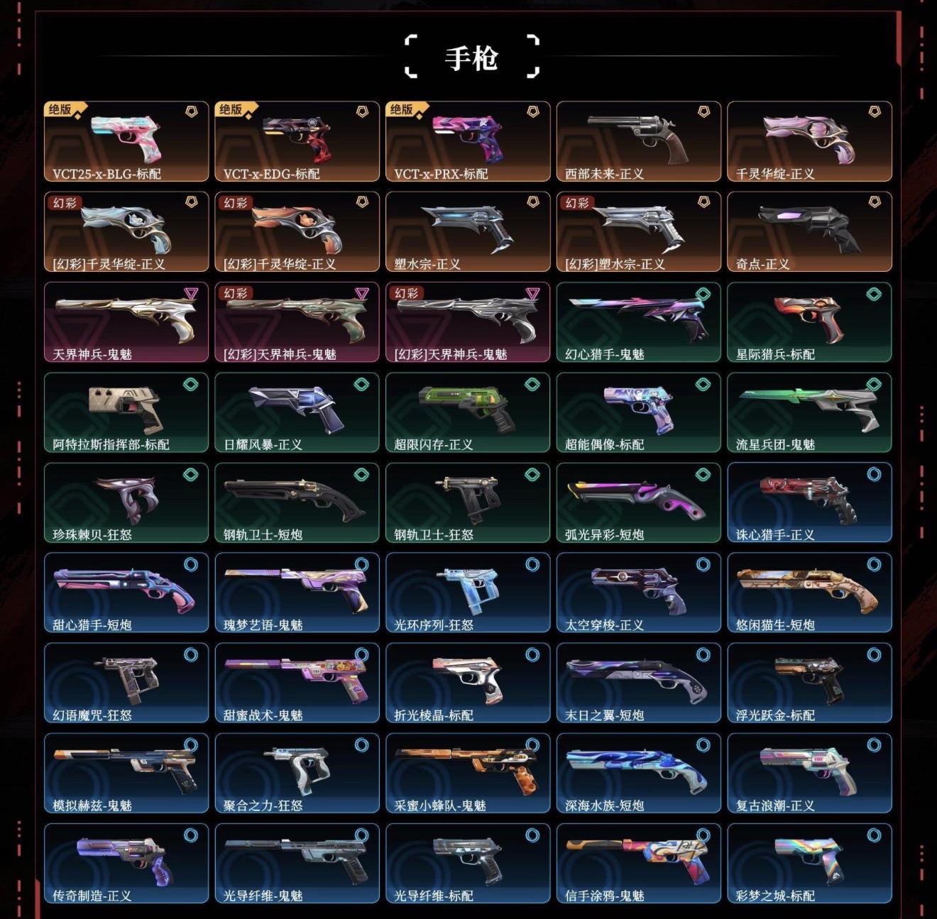 VCT25-x-BLG-标配,VCT-x-EDG-标配,VCT-x-PRX-标配,西部未来-正义,千灵华绽-正义,塑水宗-正义,奇点-正义,天界神兵-鬼魅,幻心猎手-鬼魅,星际猎兵-标配,阿特拉斯指挥部-标配,日耀风暴-正义,超限闪存-正义,超能偶像-标配,流星兵团-鬼魅,珍珠棘贝-狂怒,钢轨卫士-短炮,钢轨卫士-狂怒,弧光异彩-短炮,诛心猎手-正义,甜心猎手-短炮,瑰梦艺语-鬼魅,光环序列-狂怒,太空穿梭-正义,悠闲猫生-短炮,幻语魔咒-狂怒,甜蜜战术-鬼魅,折光棱晶-标配,末日之翼-短炮,浮光跃金-标配,模拟赫兹-鬼魅,聚合之力-狂怒,采蜜小蜂队-鬼魅,深海水族-短炮,复古浪潮-正义,传奇制造-正义,光导纤维-鬼魅,光导纤维-标配,信手涂鸦-鬼魅,彩梦之城-标配,