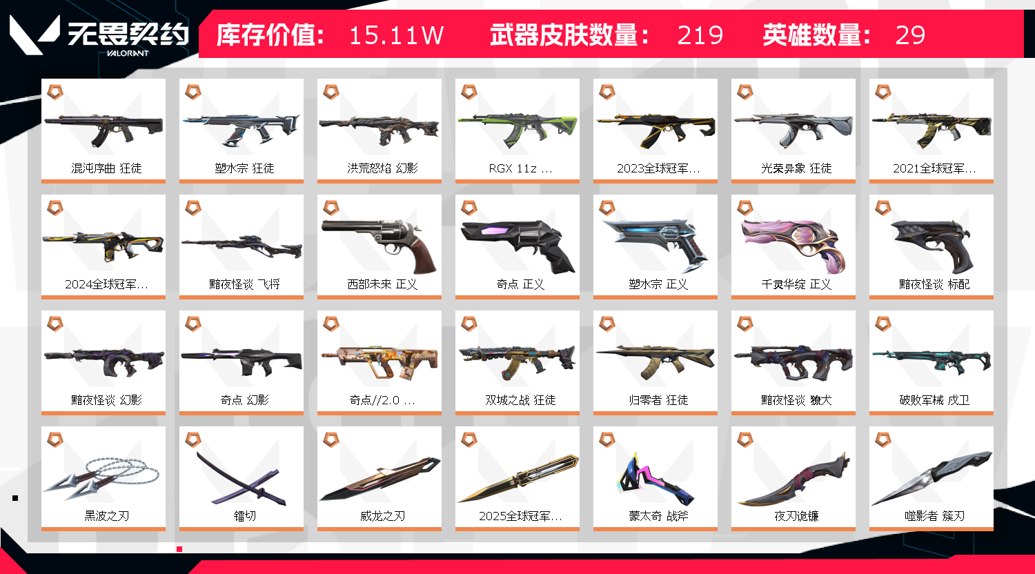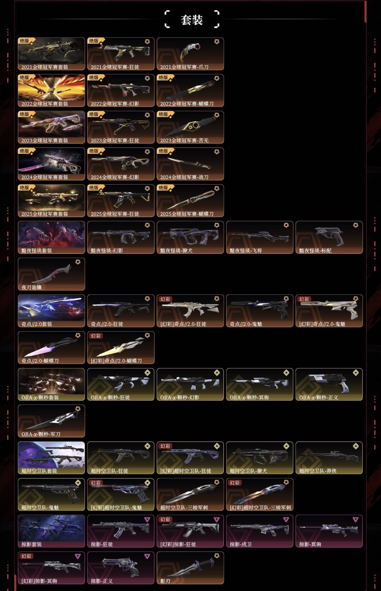 ORA-x-颗秒套装(ORA-x-颗秒-狂徒,ORA-x-颗秒-幻影,ORA-x-颗秒-冥驹,ORA-x-颗秒-正义,ORA-x-颗秒-军刀)超时空卫队套装(超时空卫队-狂徒,超时空卫队-獠犬,超时空卫队-莽侠,超时空卫队-鬼魅,超时空卫队-三棱军刺)2022全球冠军赛套装(2022全球冠军赛-幻影,2022全球冠军赛-蝴蝶刀)黯夜怪谈套装(黯夜怪谈-幻影,黯夜怪谈-獠犬,黯夜怪谈-飞将,黯夜怪谈-标配,夜刃诡镰)奇点2.0套装(奇点//2.0-狂徒,奇点//2.0-鬼魅,奇点//2.0-蝴蝶刀)2025全球冠军赛套装(2025全球冠军赛-狂徒,2025全球冠军赛-蝴蝶刀)2024全球冠军赛套装(2024全球冠军赛-幻影,2024全球冠军赛-战刀)2023全球冠军赛套装(2023全球冠军赛-狂徒,2023全球冠军赛-苦无)2021全球冠军赛套装(2021全球冠军赛-狂徒,2021全球冠军赛-爪刀)掠影套装(掠影-狂徒,掠影-冥驹,掠影-戍卫,掠影-正义,影刃)