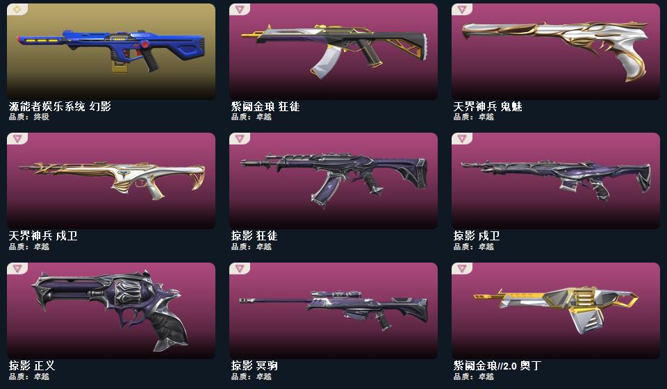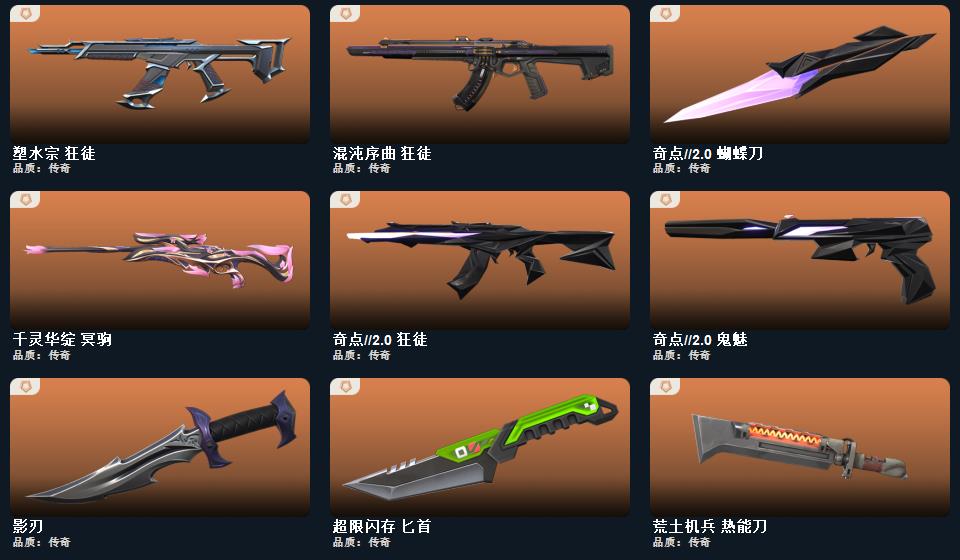 奇点2.0套装,掠影套装 近战武器-超限闪存匕首,近战武器-奇点2.0蝴蝶刀,近战武器-影刃,近战武器-荒土机兵热能刀,鬼魅-奇点2.0,狂徒-奇点2.0,狂徒-塑水宗,狂徒-混沌序曲,冥驹-千灵华绽,幻影-源能者娱乐系统,鬼魅-天界神兵,正义-掠影,狂徒-掠影,狂徒-紫阙金琅,戍卫-天界神兵,戍卫-掠影,冥驹-掠影,奥丁-紫阙金琅2.0,标配-荒土机兵,正义-超限闪存,骇灵-荒土机兵,蜂刺-超限闪存,狂徒-荒土机兵,幻影-超限闪存,冥驹-荒土机兵,莽侠-超限闪存,正义-纳米