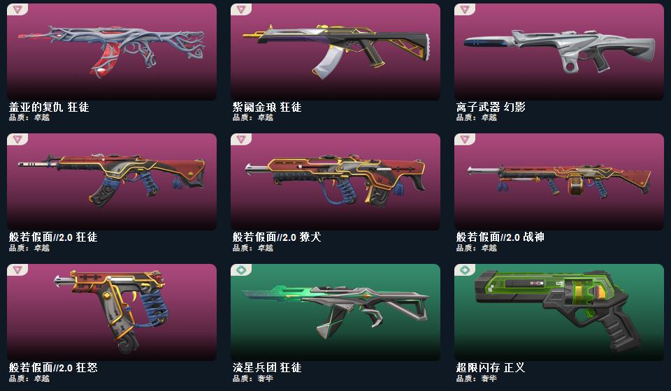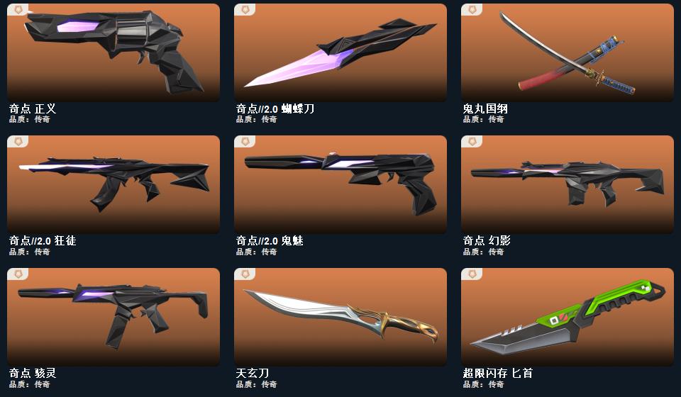 奇点2.0套装,般若假面2.0套装 近战武器-鬼丸国纲,近战武器-超限闪存匕首,近战武器-奇点2.0蝴蝶刀,近战武器-天玄刀,鬼魅-奇点2.0,正义-奇点,骇灵-奇点,狂徒-奇点2.0,幻影-奇点,狂怒-般若假面2.0,狂徒-盖亚的复仇,狂徒-紫阙金琅,狂徒-般若假面2.0,幻影-离子武器,獠犬-般若假面2.0,战神-般若假面2.0,骇灵-流星兵团,正义-超限闪存,蜂刺-超限闪存,幻影-超限闪存,狂徒-流星兵团,莽侠-超限闪存,奥丁-流星兵团,鬼魅-星云暗涌,正义-纳米打击,