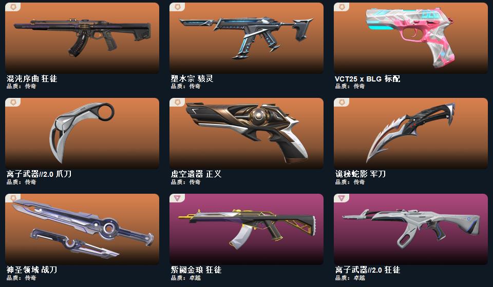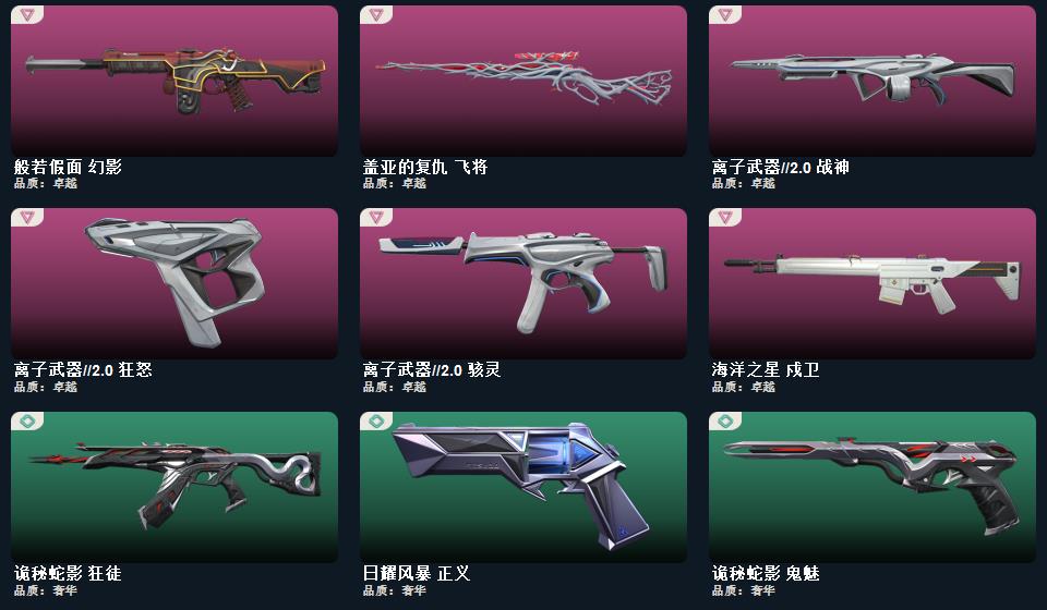 离子武器//2.0套装 离子武器//2.0-爪刀 诡秘蛇影-军刀,神圣领域-战刀, 离子武器//2.0-狂徒,离子武器//2.0-战神,离子武器//2.0-骇灵,离子武器//2.0-狂怒,混沌序曲-狂徒,紫阙金琅-狂徒,般若假面-幻影,海洋之星-戍卫,诡秘蛇影-狂徒,神圣领域-獠犬,神圣领域-幻影,末日之翼-幻影,折光棱晶-戍卫,月球哨兵-戍卫,盖亚的复仇-飞将,诡秘蛇影-莽侠,末日之翼-飞将,星云暗涌-冥驹,月球哨兵-莽侠,神圣领域-战神,末日之翼-奥丁,塑水宗-骇灵,折光
