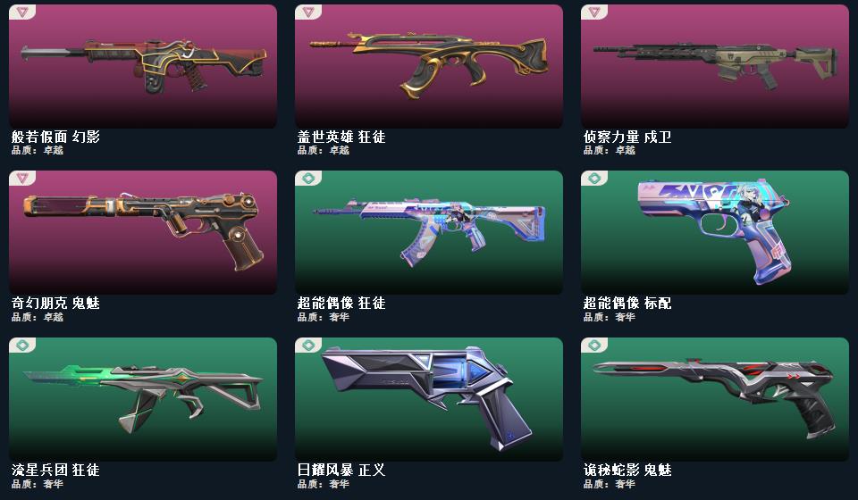 超限闪存-匕首,超能偶像-应援棒,流星兵团-短剑,珍珠棘贝-短剑, 光明哨兵-狂徒,混沌序曲-狂徒,全息波普//2.0-狂徒,盖世英雄-狂徒,盖亚的复仇-狂徒,侦察力量-戍卫,般若假面-幻影,超限闪存-幻影,超能偶像-戍卫,超能偶像-狂徒,流星兵团-狂徒,珍珠棘贝-幻影,珍珠棘贝-戍卫,模拟赫兹-獠犬,浮光跃金-戍卫,聚合之力-幻影,采蜜小蜂队-獠犬,战术熊与伙伴们-戍卫,复古浪潮-獠犬,合金突袭-狂徒, 超限闪存-莽侠,模拟赫兹-冥驹,聚合之力-飞将,战术熊与伙伴们-飞将,