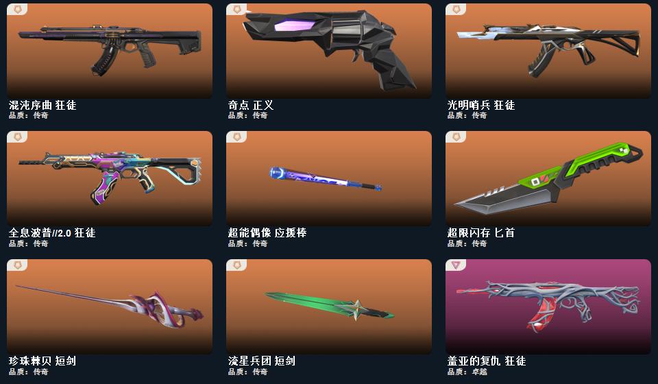 超限闪存-匕首,超能偶像-应援棒,流星兵团-短剑,珍珠棘贝-短剑, 光明哨兵-狂徒,混沌序曲-狂徒,全息波普//2.0-狂徒,盖世英雄-狂徒,盖亚的复仇-狂徒,