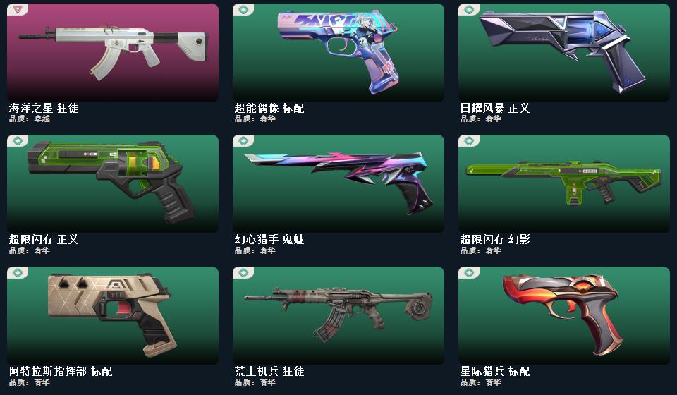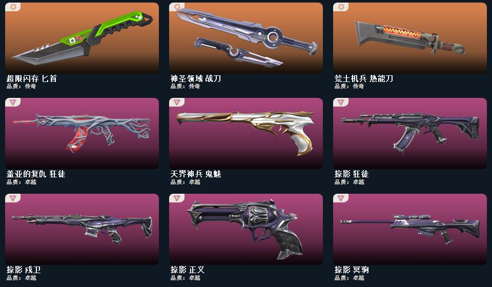 奇点2.0套装,掠影套装 近战武器-超限闪存匕首,近战武器-奇点2.0蝴蝶刀,近战武器-影刃,近战武器-荒土机兵热能刀, 鬼魅-奇点2.0,正义-奇点,骇灵-奇点,狂徒-奇点2.0,狂徒-混沌序曲,幻影-奇点,獠犬-归零者,鬼魅-天界神兵,正义-掠影,狂徒-掠影,狂徒-盖亚的复仇,狂徒-海洋之星,戍卫-掠影,冥驹-掠影,近战武器-神圣领域战刀,狂怒-神圣领域,标配-荒土机兵,正义-超限闪存,标配-超能偶像,骇灵-荒土机兵,蜂刺-超限闪存,獠犬-神圣领域,幻影-神圣领域,狂徒-