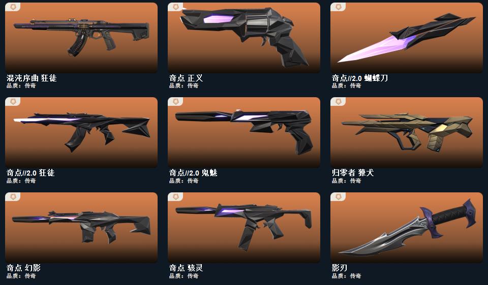 奇点2.0套装,掠影套装 近战武器-超限闪存匕首,近战武器-奇点2.0蝴蝶刀,近战武器-影刃,近战武器-荒土机兵热能刀, 鬼魅-奇点2.0,正义-奇点,骇灵-奇