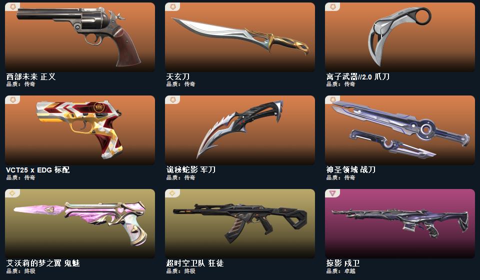 超时空卫队狂徒 诡秘蛇影军刀 VCT25XEDG标配 离子武器2.0爪刀 神圣领域战刀 西部未来正义 天玄刀 艾沃莉的梦之翼鬼魅 日冕雄狮狂徒 冰点凝冻狂徒