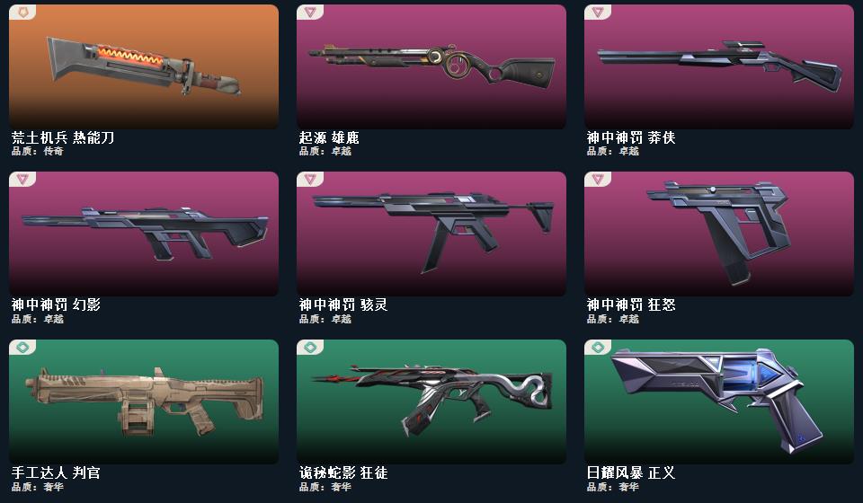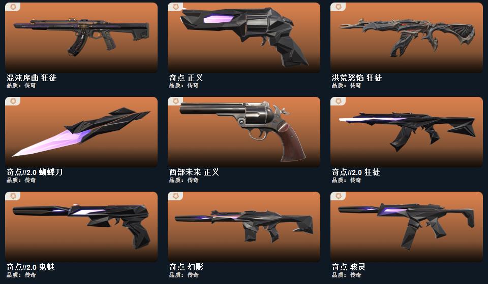 电音光谱标配 神之刃 诡秘蛇影军刀 混沌序曲狂徒 神圣领域战刀 西部未来幻影 西部未来飞将 西部未来奥丁 未来开拓者 西部未来正义 洪荒怒焰狂徒 奇点幻影 奇点2.0狂徒 奇点2.0蝴蝶刀 奇点2.0魅影 奇点正义 奇点骇灵