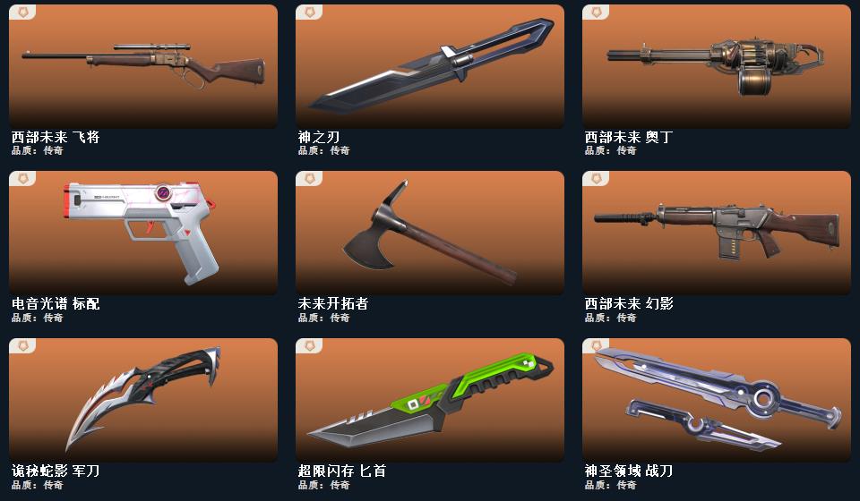 电音光谱标配 神之刃 诡秘蛇影军刀 混沌序曲狂徒 神圣领域战刀 西部未来幻影 西部未来飞将 西部未来奥丁 未来开拓者 西部未来正义 洪荒怒焰狂徒 奇点幻影 奇点