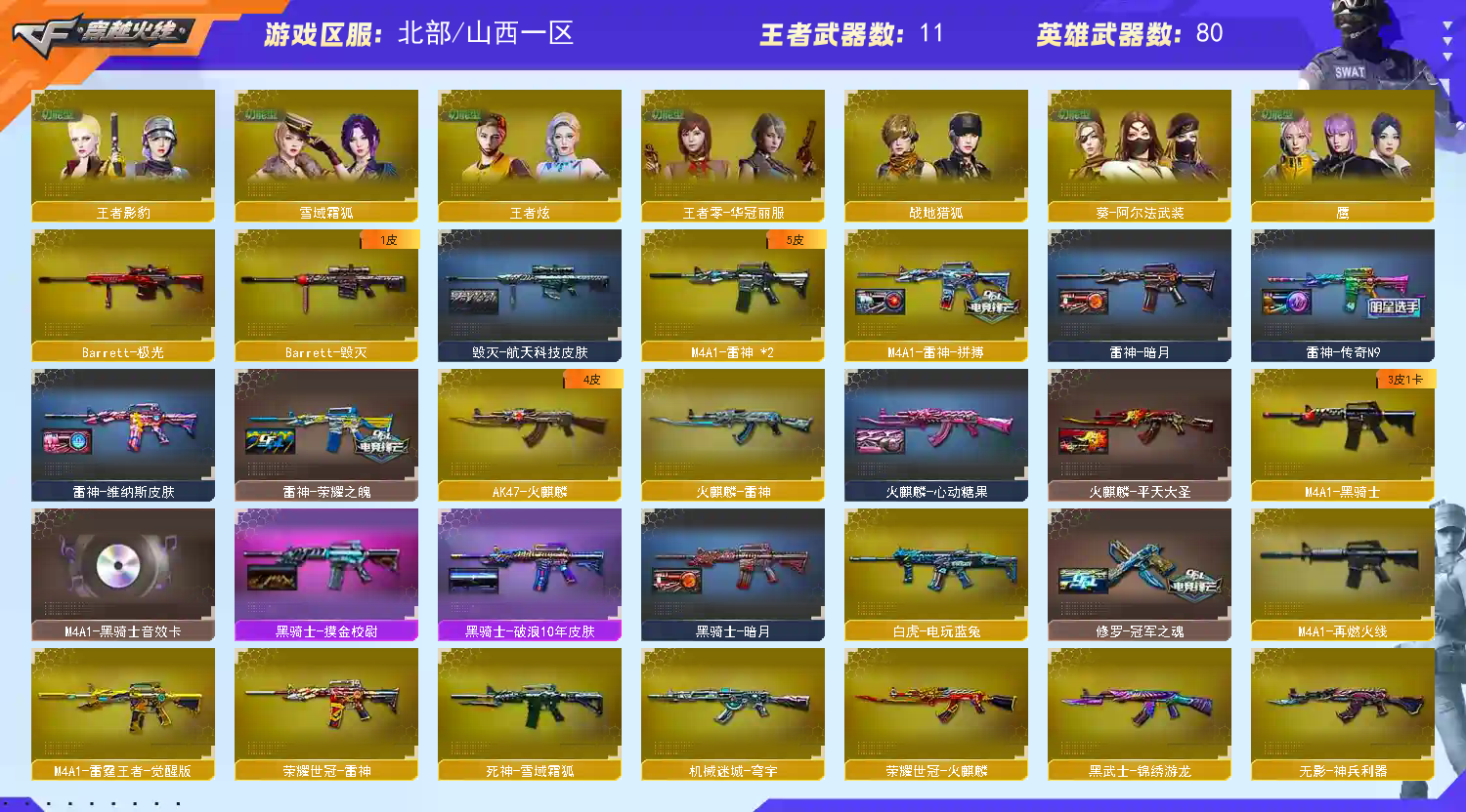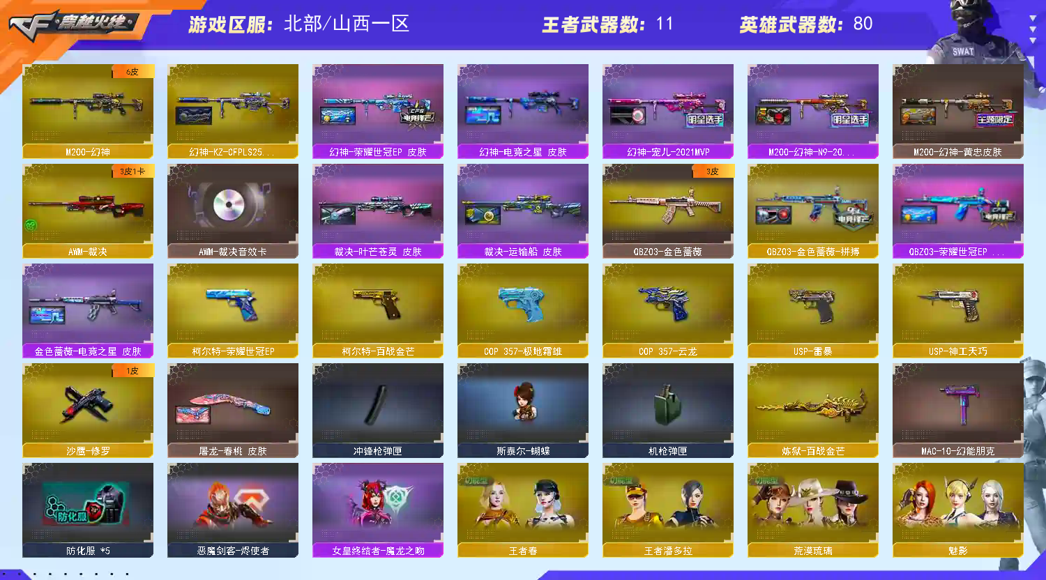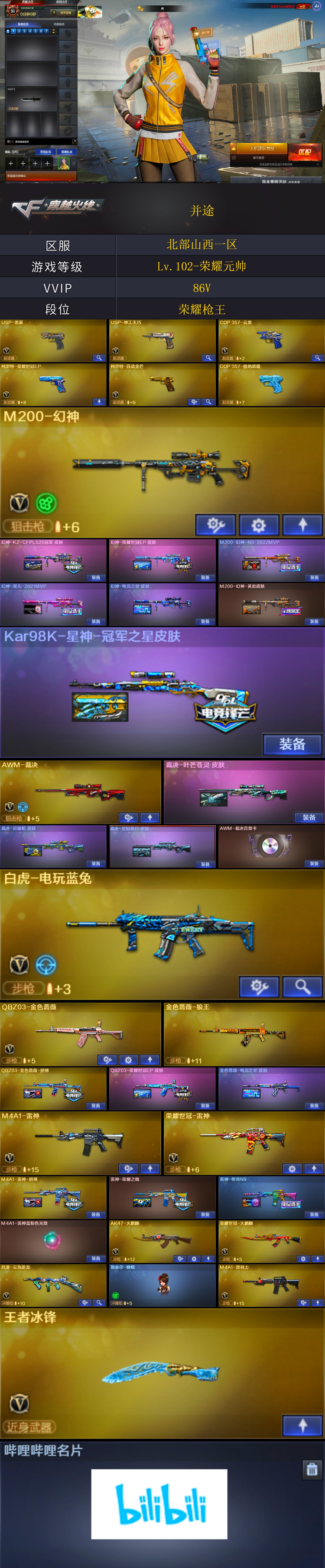 【商品标题】:北部山西一区-86V-可二次实名-【Lv.102-荣耀元帅】-【段位:荣耀枪王】 【稀有武器】:M200-幻神/USP-雷暴/USP-神工天巧/COP357-云龙/QBZ03-金色蔷薇/AK47-火麒麟/M4A1-雷神(2)/M4A1-黑骑士/荣耀世冠-火麒麟/荣耀世冠-雷神/白虎-电玩蓝兔/Barrett-毁灭/Barrett-极光/AWM-裁决/斩神刀-雷暴/幻灵之锋/唐刀-神工天巧/云龙扇 【王者武器】:M4A1-雷霆王者-觉醒版 【热门角色】:荒漠琉璃/鹰/魅影/奇洋探员/乔伊教练/王者春/王者潘多拉/王者影豹/王者炫/新海豹突击队/灵狐者-职业经理/潘多拉-X/兔囡囡/潘多拉 【热门音效卡】:AWM-裁决音效卡/M4A1-黑骑士音效卡 【热门皮肤】:M200-幻神-N9-2022MVP/幻神-宠儿-2021MVP/Kar98K-星神-冠军之星皮肤/雷神-传奇N9/屠龙-春桃皮肤/雷神-荣耀之魄 【其他亮点】:斯泰尔-蝴蝶/贝雷塔687-射手座/金刚伞-电玩红兔/M14EBR-冠军金牛/哔哩哔哩名片 (截图展示段位不代表实际段位,如赛季更新等不可抗拒因素发生变化,其余道具看截图或咨询客服);USP-雷暴,QBZ03-金色蔷薇,M200-幻神,