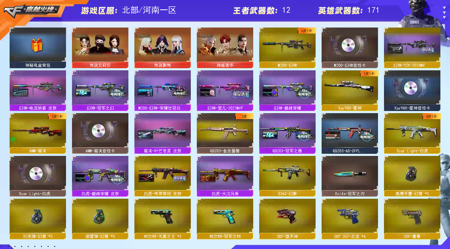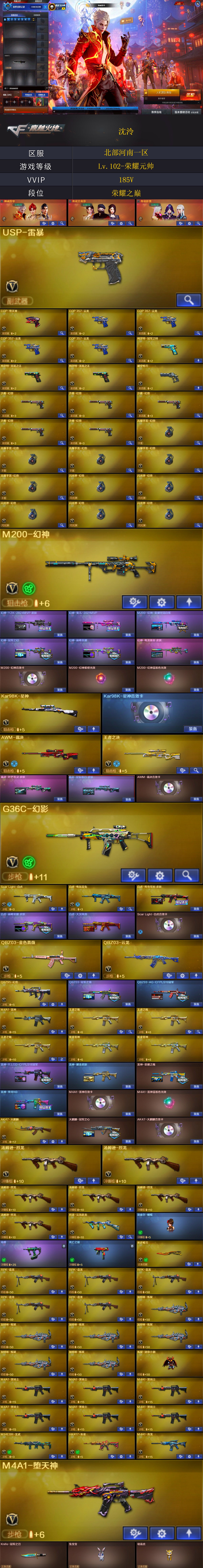 商品标题】:北部河南一区-185V-可二次实名-【Lv.102-荣耀元帅】-【段位:荣耀之巅】 【稀有武器】:M200-幻神/Kar98K-星神/G36C-幻影/ScarLight-白虎/M14EBR-玄武/M4A1-青龙/HK417-朱雀/M4A1-堕天神/USP-雷暴/COP-堕天神/天神-动感闪耀/COP357-云龙(4)/柯尔特-无冕之王(2)/破空枪刃/沙鹰-幻兽(5)/柯尔特-冠军之特/QBZ03-云龙/QBZ03-金色蔷薇/QBZ95-幻兽/AK47-火麒麟(3)/M4A1-黑龙/M4A1-雷神/M4A1-黑骑士(6)/AK47-黑武士/白虎-电玩蓝兔/Barrett-毁灭(2)/Barrett-极光/AWM-裁决/RPK-盘龙(5)/加特林-炼狱(6)/汤姆逊-烈龙(6)/AA-12-雷霆/炽芒蝶刃/斩神刀-雷暴/麒麟刺-堕天神/龙啸-堕天神/女皇利刃-幻兽 【王者武器】:王者之魄-觉醒版(2)/王者之怒-觉醒版/王者之决-觉醒版/王者之魄 【热门角色】:传说艾莉莎/传说影煞/关小雨/蝴蝶/迷迭香/晴雅/鹰/炫/隼/奇洋探员/乔伊教练/王者春/王者-魅影/王者潘多拉/王者沙漠玫瑰/空/女主播/潘多拉-X/兔囡囡/职业选手/潘多拉 【热门音效卡】:M200-幻神音效卡/Kar98K-星神音效卡/AWM-裁决音效卡/Scar Light-白虎音效卡/M4A1-雷神音效卡/Barrett-毁灭音效卡/M4A1-黑骑士音效卡/AK47-火麒麟音效卡 【热门皮肤】:幻神-宠儿-2021MVP/M200-幻神-荣耀世冠白鲨/幻神-冠军之幻/幻神-巅峰荣耀/幻神-电流骇客皮肤/HK417-朱雀-武当/雷神-R.LGD-CFPLS18冠军/QBZ03-冠军之薇/白虎-巅峰荣耀 皮肤/白虎-大汉风骨/毁灭-直播专属/QBZ03-AG-CFPLS19冠军/毁灭-BEAN-2020MVP/雷神-传奇N9/火麒麟-冠军之心/屠龙-荣耀之锋(3)/毁灭-荣耀之怒/龙啸-冠军之啸/雷神-荣耀之魄 【其他亮点】:斯泰尔-蝴蝶/炼狱-迷你小钢/Knife-冠军之刃/毒蜂/异变清道夫/贝雷塔687-射手座(2)/金刚伞-电玩红兔/迷你泡泡象/兔宝宝 (截图展示段位不代表实际段位,如赛季更新等不可抗拒因素发生变化,其余道具看截图或咨询客服);USP-雷暴,柯尔特-无冕之王,柯尔特-冠军之特,炽芒蝶刃,Knife-冠军之刃,传说影煞,隼,