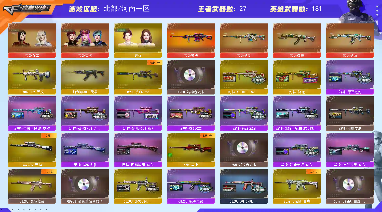 首页 > 租号大厅 > 穿越火线 > 北部/河南一区 > 【北部】传说女帝+圣谕⭐幻神EP10皮+音⭐裁决套+星神2皮⭐白虎蔷薇套⭐天袭幻影