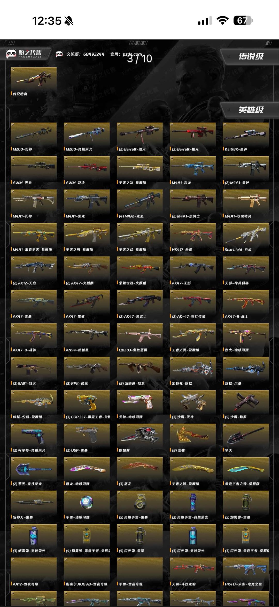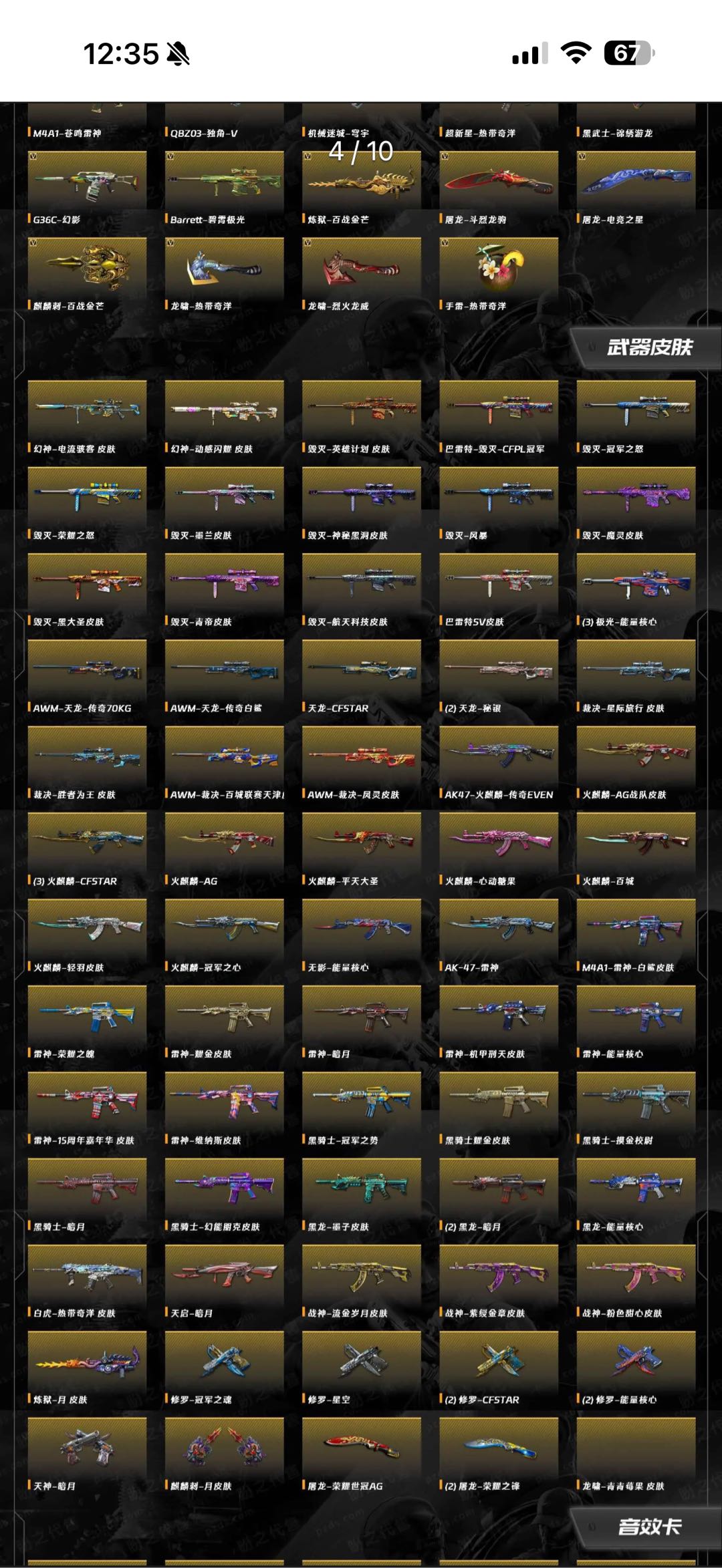 传说暗裔/幻神电流骇客 /幻神动感闪耀 /毁灭英雄计划 /毁灭CFPL冠军/毁灭冠军之怒/毁灭荣耀之怒/毁灭墨兰/毁灭神秘黑洞/毁灭风暴/毁灭魔灵/_葵/_樱/魅影/_迷迭香/电竞教官-云悠悠/M200-幻神/M200-竞技荣光/Barrett-毁灭(2)/Barrett-极光(3)/Kar98K-星神/竞技荣光套装/雷暴套装/雷霆王者套装/臻选金狐套装/M200-幻神音效卡/Scar Light-白虎音效卡/白虎-盛典舞曲音效卡/M4A1-雷神音效卡/M4A1-黑骑士音效卡/AK47-火麒麟音效卡/烈火-动感闪耀 音效卡/Barrett-毁灭音效卡/AWM-昌龙-怀旧音效卡/AWM-裁决音效卡/Barrett-极光音效卡/Barrett-碧霄极光音效卡/沙鹰-修罗-盛典舞曲音效卡/炼狱-百战金芒-庆典舞曲音效卡/屠龙-动感闪耀 音效卡/麒麟刺-百战金芒-盛典舞曲音效卡;USP-雷暴,电竞教官-云悠悠,RPK-盘龙,QBZ03-金色蔷薇,G36C-幻影,M200-幻神,Scar Light-白虎,