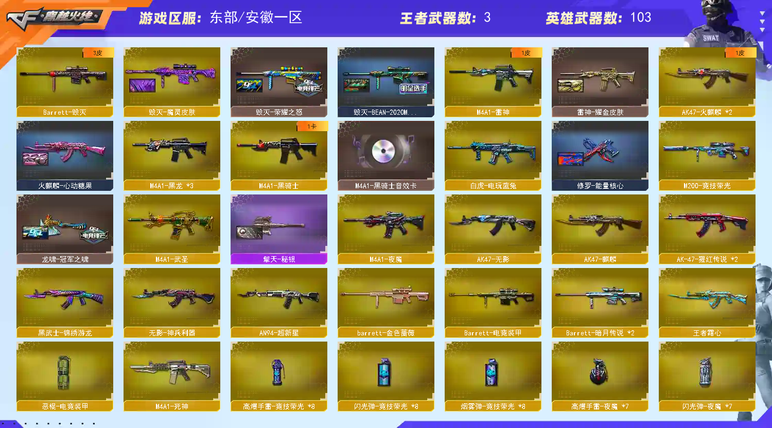 【竞技荣光套+四防云悠悠+usp雷暴】【传说梦魇】【ScarLight-白虎+音效卡+暗星】【QBZ03-金色蔷薇】【生化 盘龙 6炼狱 6烈龙 迷你小钢 蝴蝶 死亡之眼 毒蜂】【Barrett-毁灭+魔灵+毁灭-荣耀之怒】【极光】【夜魔】【AK47-火麒麟】【麒麟】【黑龙】【M4A1-雷神】【黑骑士+音效卡】【王者之烈 王者霜心】【无影 死神 超新星】【6手枪 修罗 cop雷霆 竞技荣光*2】【9近战 屠龙 龙啸*3 擎天 】【手雷 夜魔雷 竞技荣光 】【四防 凌霄 沙漠玫瑰 王者葵惊若翩鸿 王者沙漠玫瑰 王者涂鸦】;沙漠玫瑰,电竞教官-云悠悠,王者沙漠玫瑰,RPK-盘龙,QBZ03-金色蔷薇,Scar Light-白虎,
